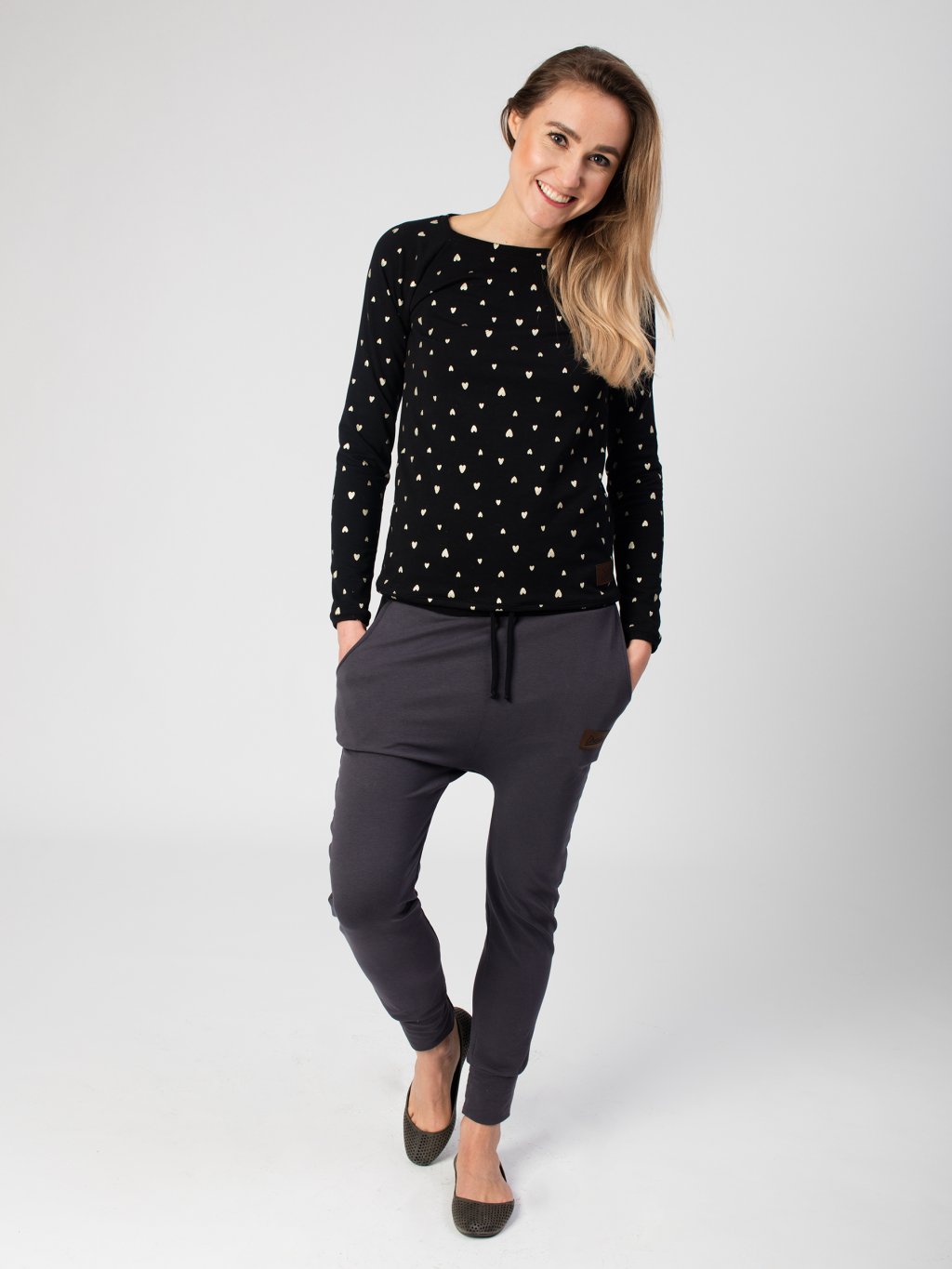 - Snížený sed – moderní a uvolněný střih, který nabízí volnost pohybu a jedinečný styl.