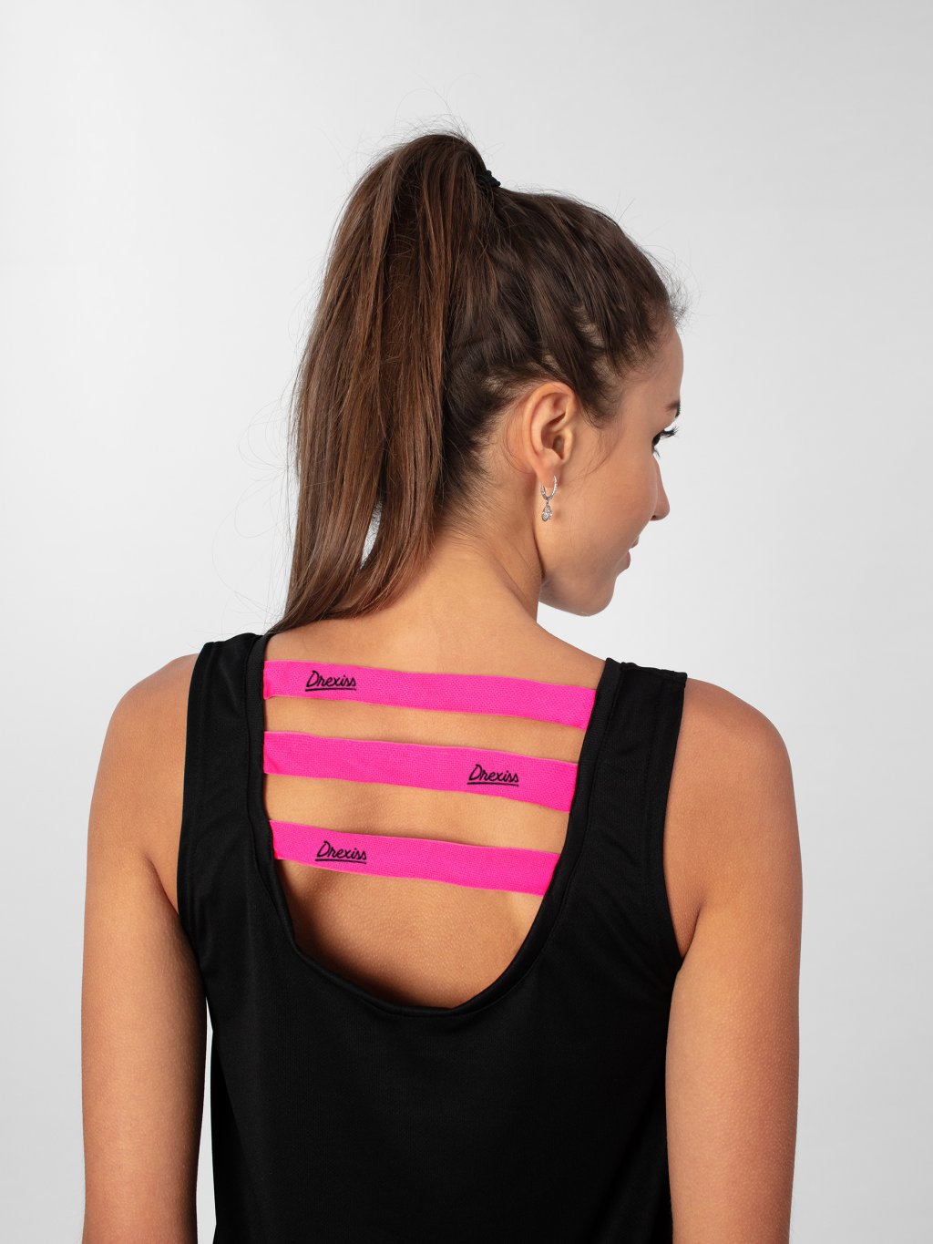Jedinečným prvkem je průstřih v zádové části s designovým detailem v podobě tří pásků, které dodávají tílku originální charakter. Tento detail působí decentně, sportovně a zároveň žensky, díky čemuž tílko vyniká mezi klasickými funkčními kousky.