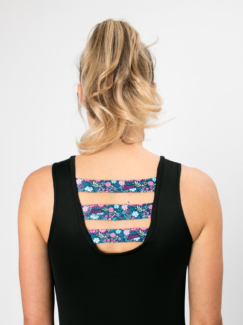 Jedinečným prvkem je průstřih v zádové části s designovým detailem v podobě tří pásků, které dodávají tílku originální charakter. Tento detail působí decentně, sportovně a zároveň žensky, díky čemuž tílko vyniká mezi klasickými funkčními kousky.