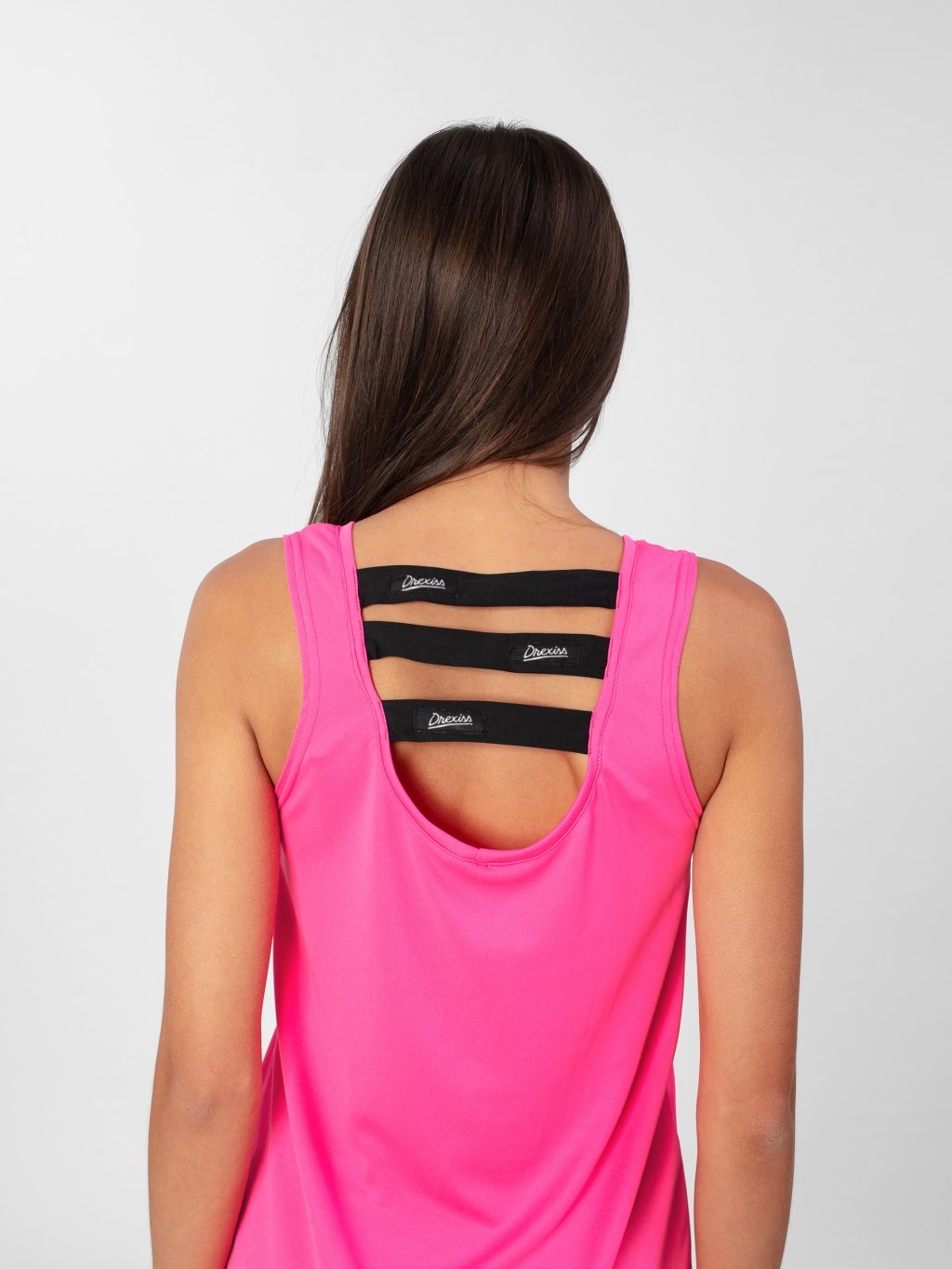 Jedinečným prvkem je průstřih v zádové části s designovým detailem v podobě tří pásků, které dodávají tílku originální charakter. Tento detail působí decentně, sportovně a zároveň žensky, díky čemuž tílko vyniká mezi klasickými funkčními kousky.