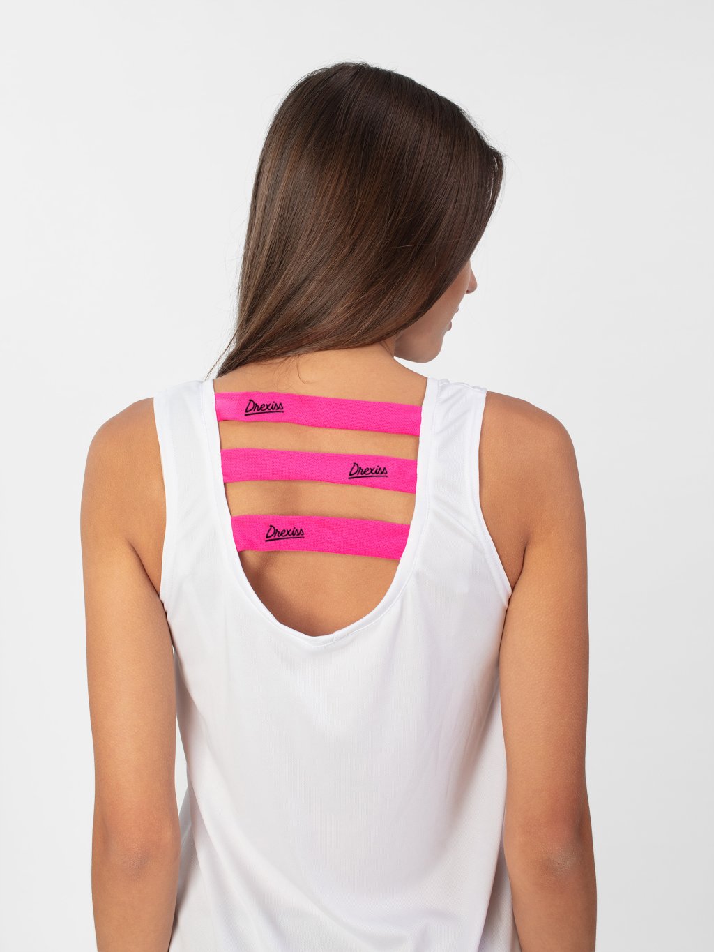 Jedinečným prvkem je průstřih v zádové části s designovým detailem v podobě tří pásků, které dodávají tílku originální charakter. Tento detail působí decentně, sportovně a zároveň žensky, díky čemuž tílko vyniká mezi klasickými funkčními kousky.