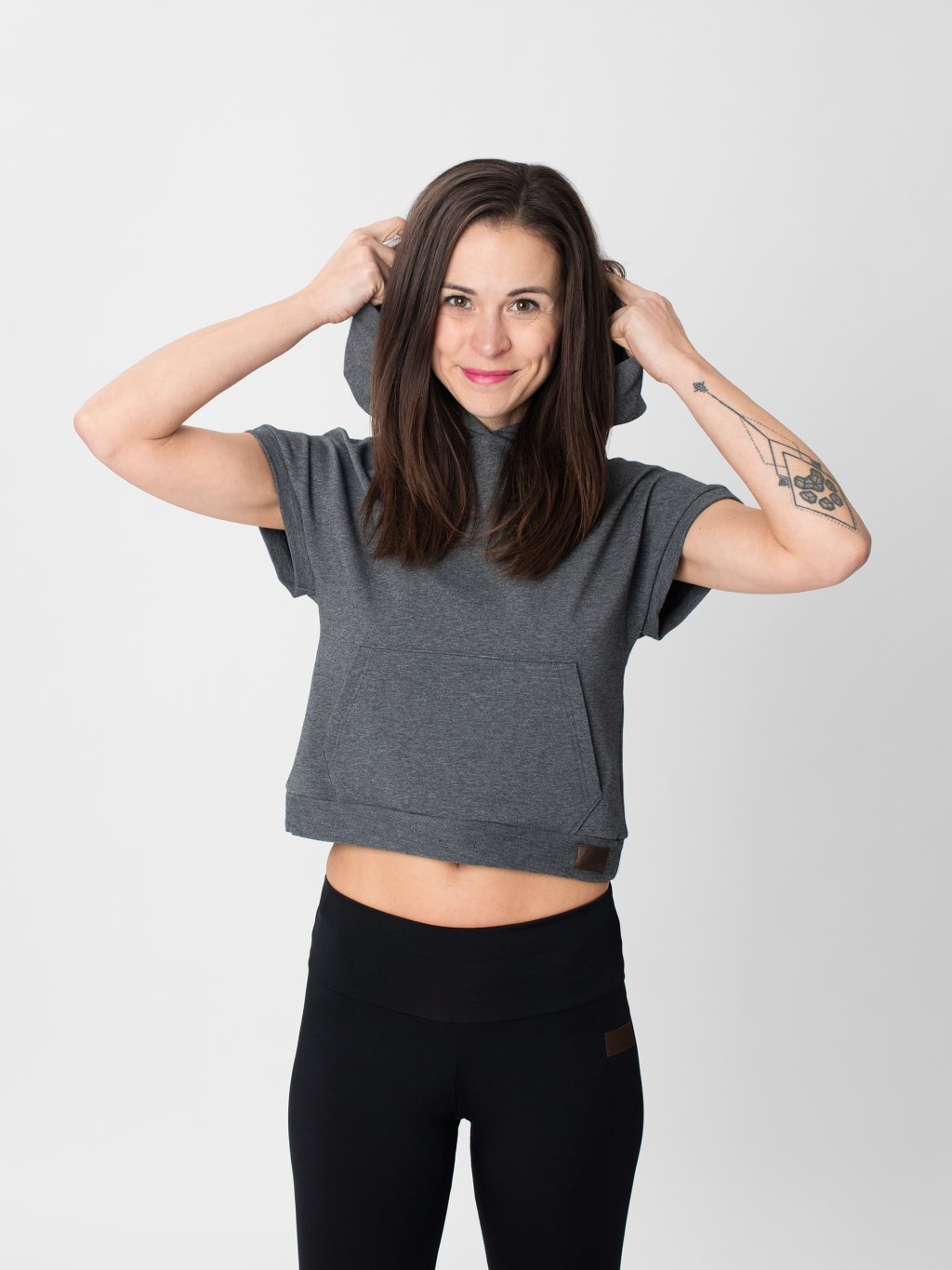 Zajímavým detailem jsou náplety se strukturou, které croptopu dodávají osobitý charakter. Prostorná klokanka je praktická na drobnosti, které chcete mít po ruce.