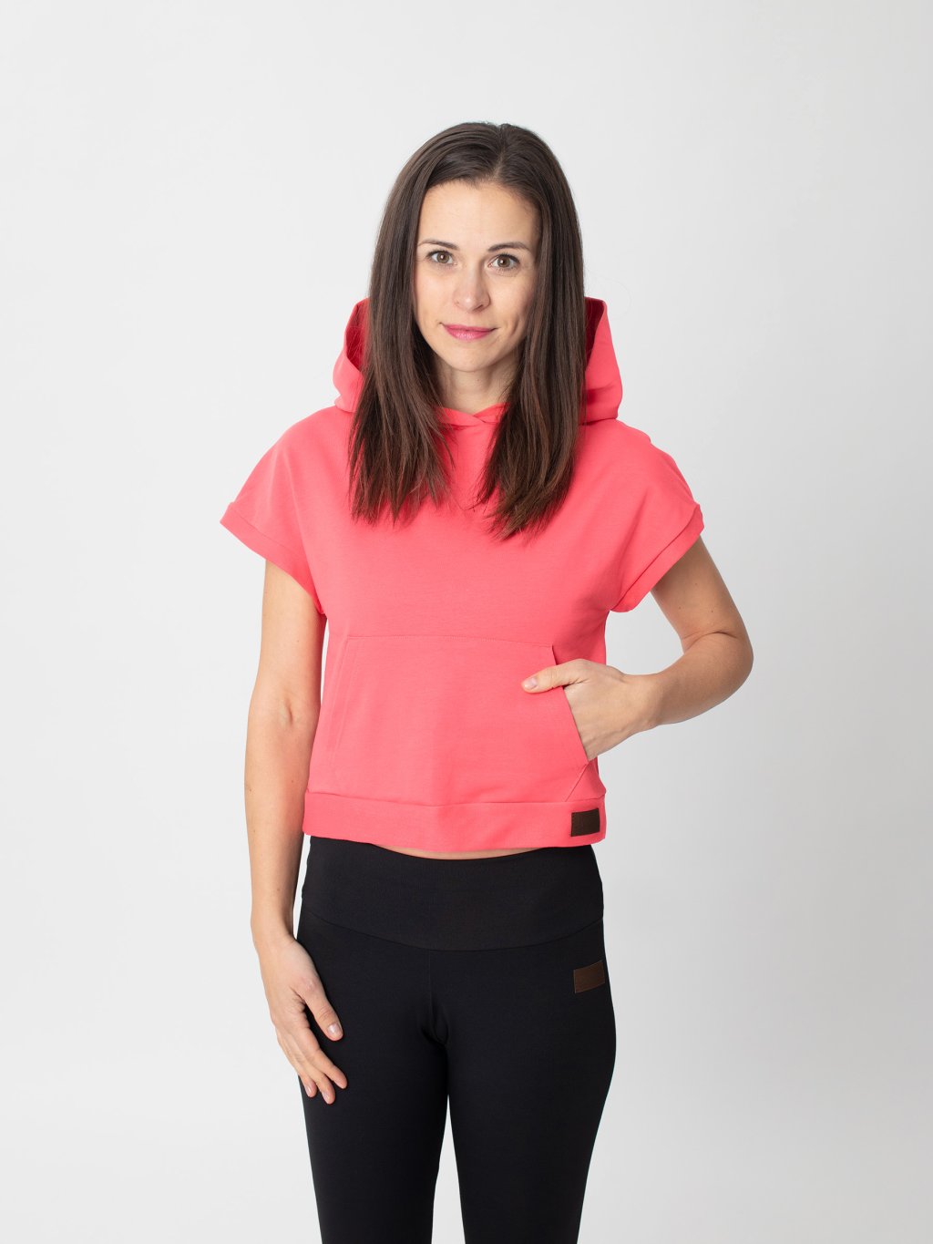 Zajímavým detailem jsou náplety se strukturou, které croptopu dodávají osobitý charakter. Prostorná klokanka je praktická na drobnosti, které chcete mít po ruce.
