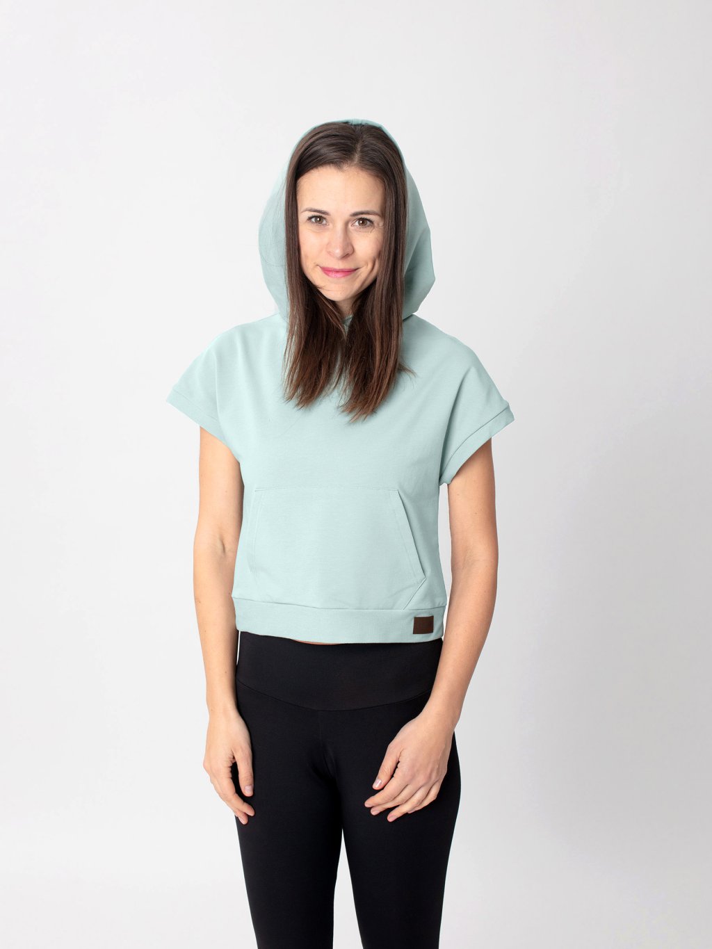 Zajímavým detailem jsou náplety se strukturou, které croptopu dodávají osobitý charakter. Prostorná klokanka je praktická na drobnosti, které chcete mít po ruce.