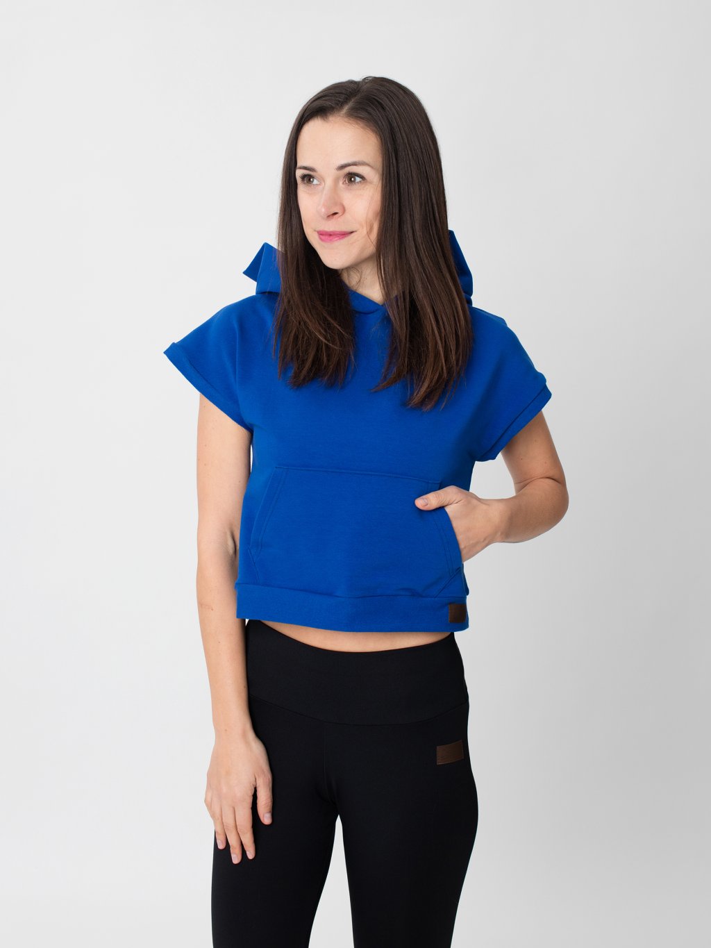 Zajímavým detailem jsou náplety se strukturou, které croptopu dodávají osobitý charakter. Prostorná klokanka je praktická na drobnosti, které chcete mít po ruce.