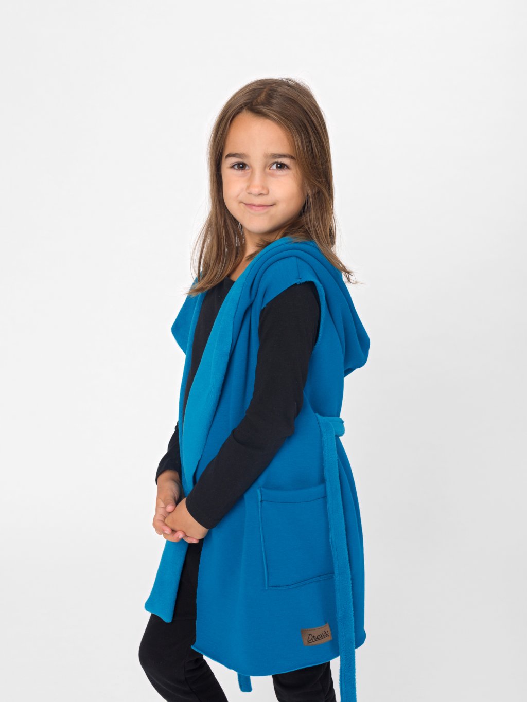 Velká kapuce ochrání před větrem a chladem a prostorné kapsy se postarají o všechny drobnosti, které je potřeba mít po ruce – od kapesníčku až po malou hračku. Vesta se hodí k legínám, džínám i sukni a díky univerzálnímu designu ji děti unosí do školky, školy i na rodinné procházky.