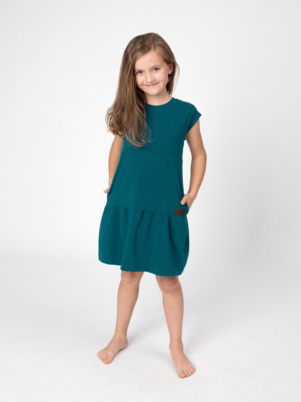 Letní šaty SOFIE pro malé slečny kombinují volnost pohybu s půvabným vzhledem. Postupně členěný střih dodává šatům lehkost a hravost, zatímco lodičkový výstřih a krátké rukávy vytvářejí čistý, elegantní dojem. Praktické kapsy jsou skvělým pomocníkem na všechny drobnosti, které chtějí mít holčičky stále u sebe.