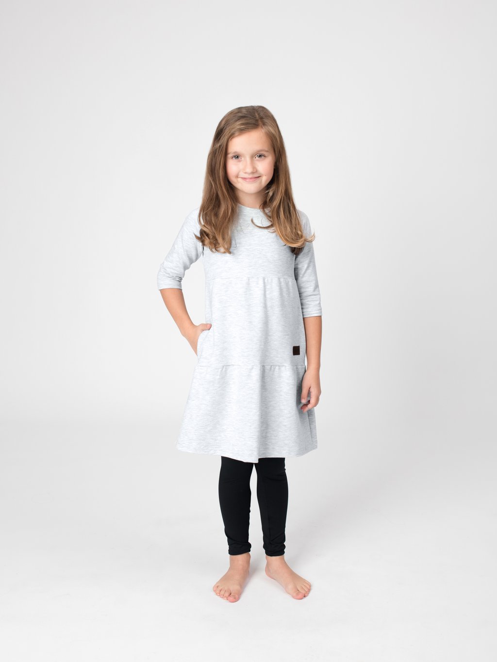Podzimní šaty SOFIE pro malé slečny s 3/4 rukávem spojují volnost pohybu s půvabným vzhledem. Postupně členěný střih dodává šatům lehkost a hravost, zatímco lodičkový výstřih a 3/4 rukávy přidávají elegantní, ale stále dětsky jemný charakter. Praktické kapsy jsou skvělým pomocníkem na všechny drobnosti, které si holčičky chtějí nosit s sebou.