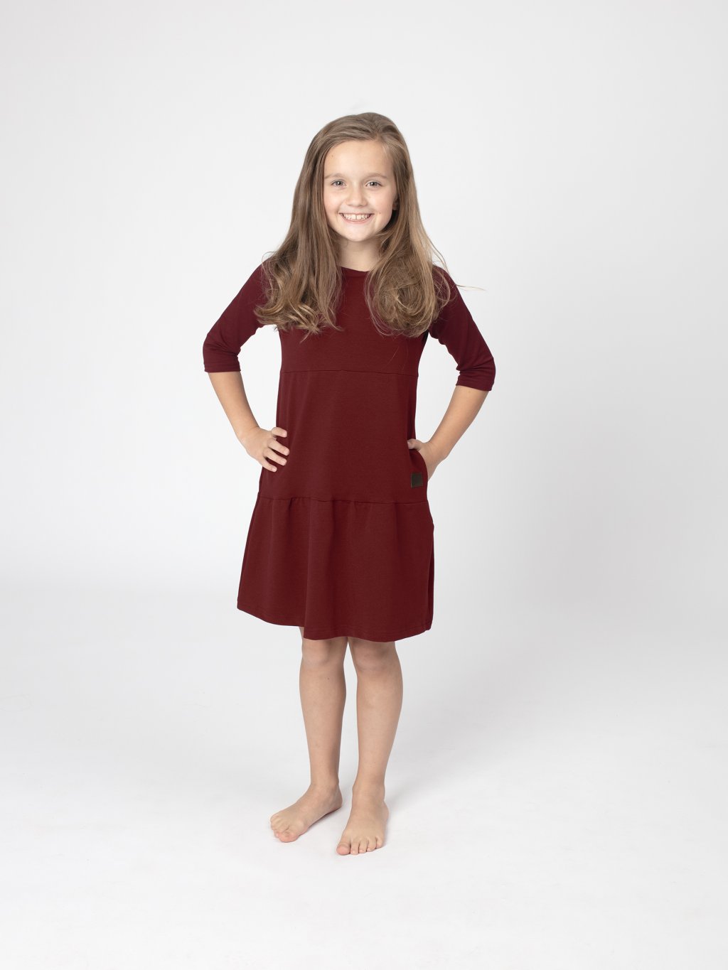 Podzimní šaty SOFIE pro malé slečny s 3/4 rukávem spojují volnost pohybu s půvabným vzhledem. Postupně členěný střih dodává šatům lehkost a hravost, zatímco lodičkový výstřih a 3/4 rukávy přidávají elegantní, ale stále dětsky jemný charakter. Praktické kapsy jsou skvělým pomocníkem na všechny drobnosti, které si holčičky chtějí nosit s sebou.