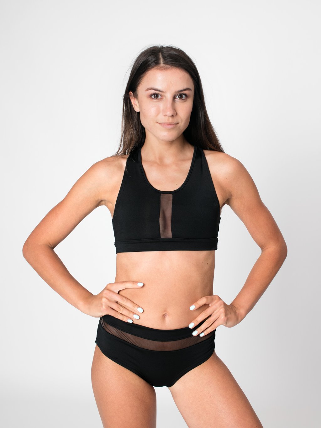 Dámské sportovní plavky v černém provedení spojují funkčnost a nadčasovou eleganci. Horní díl s průhledným síťkovým detailem v dekoltu má střih s boxerovými zády, které zajistí maximální volnost pohybu a pevné držení při plavání i vodních sportech.