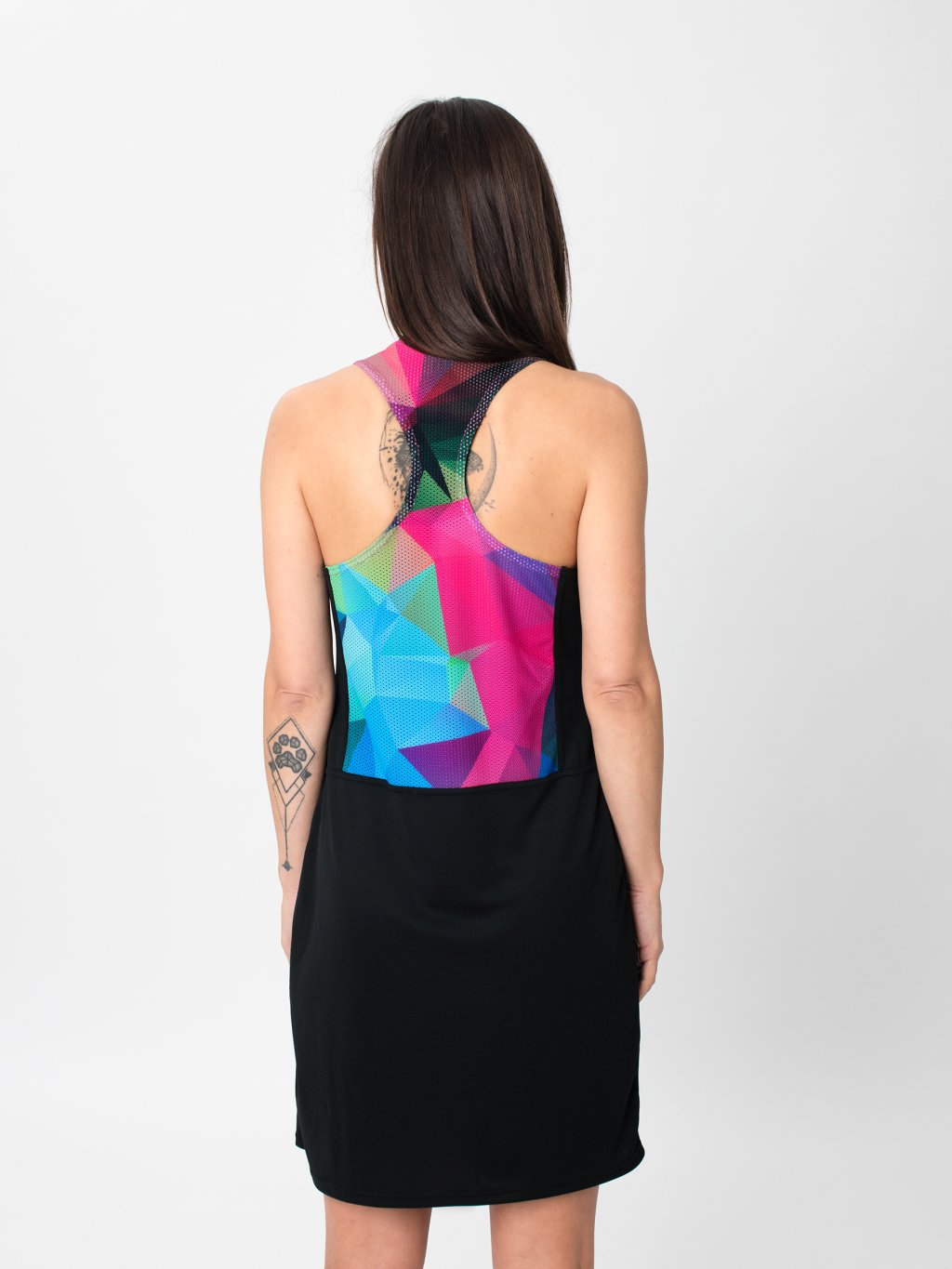 Zadní část šatů je z lehkého perforovaného funkčního úpletu, který zajišťuje maximální vzdušnost a pružnost. Moderní boxerský střih zad působí sportovně a zároveň velmi žensky.