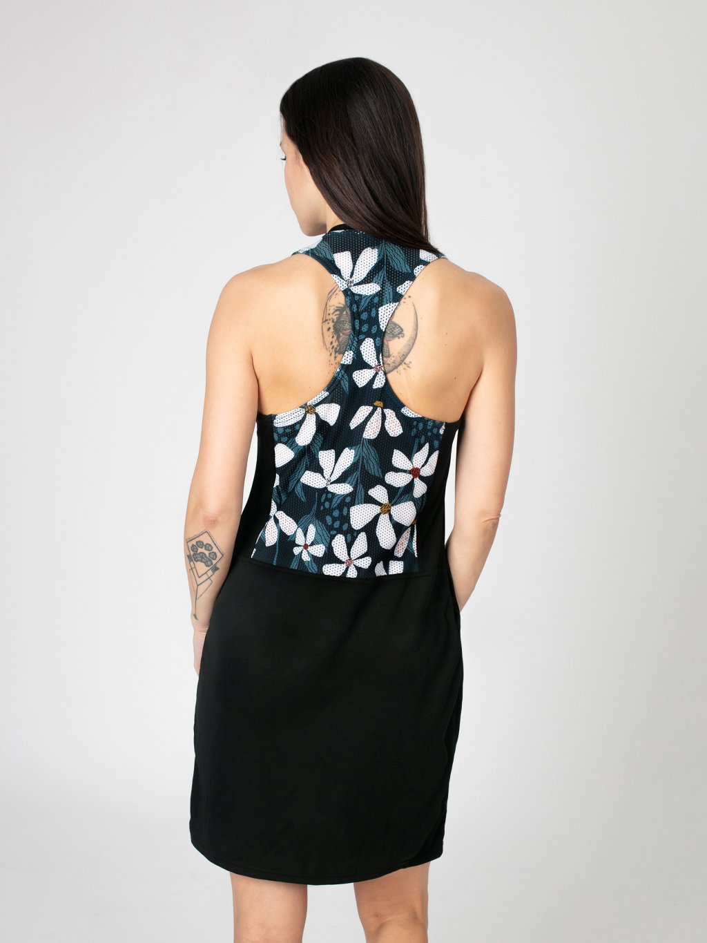 Zadní část šatů je z lehkého perforovaného funkčního úpletu, který zajišťuje maximální vzdušnost a pružnost. Moderní boxerský střih zad působí sportovně a zároveň velmi žensky.