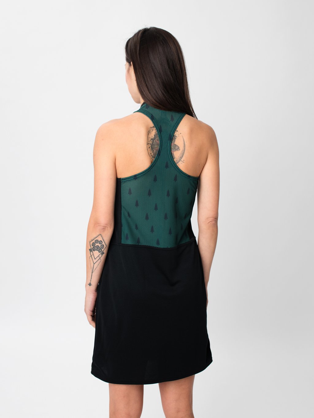 Zadní část šatů je z lehkého perforovaného funkčního úpletu, který zajišťuje maximální vzdušnost a pružnost. Moderní boxerský střih zad působí sportovně a zároveň velmi žensky.