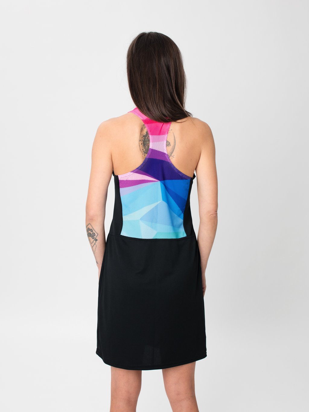 Zadní část šatů je z lehkého perforovaného funkčního úpletu, který zajišťuje maximální vzdušnost a pružnost. Moderní boxerský střih zad působí sportovně a zároveň velmi žensky.