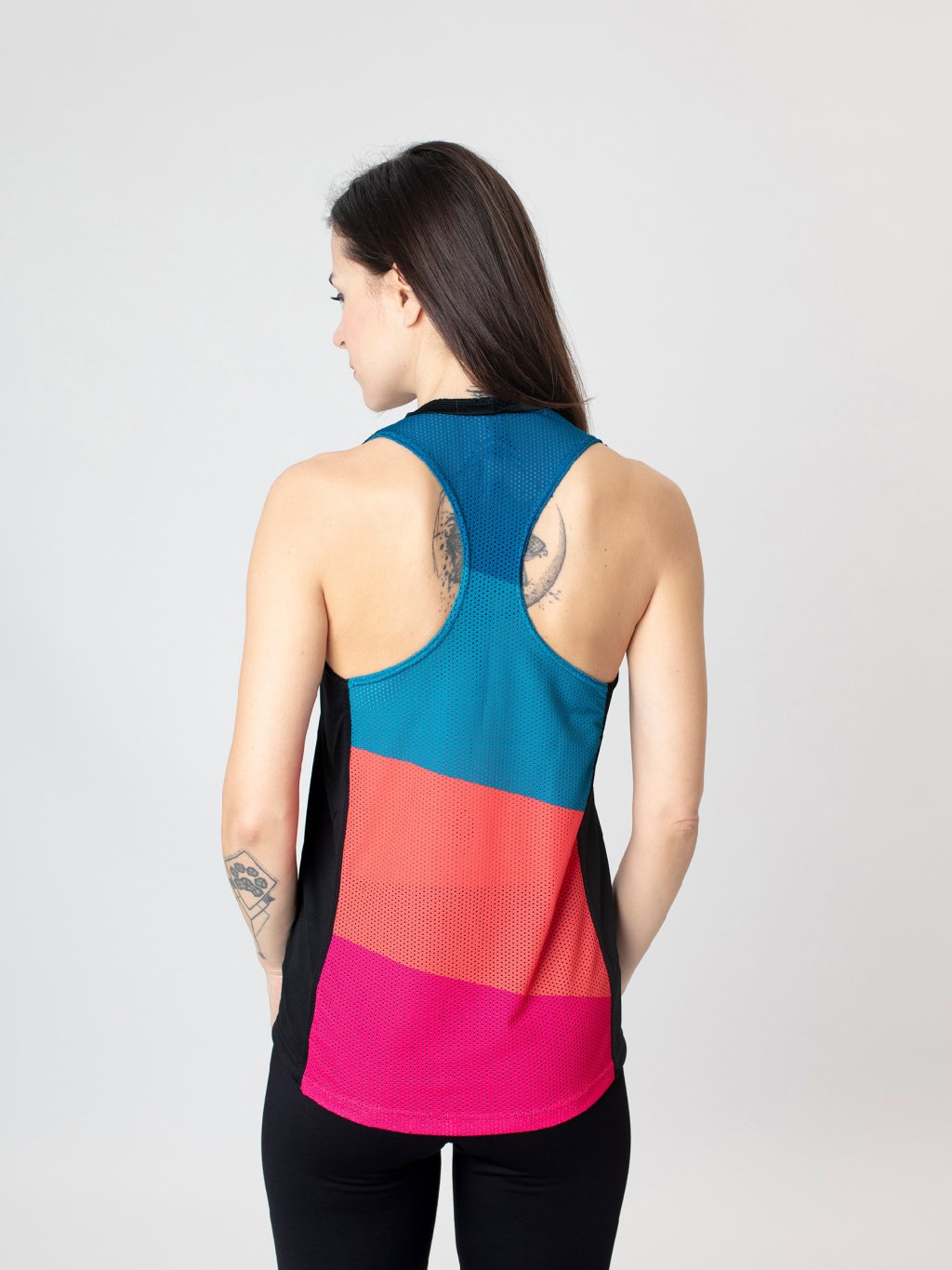 Zadní díl tvoří lehký perforovaný funkční úplet s boxerským střihem, který zajistí maximální volnost pohybu a vzdušnost. Je doplněn o originální design, který dodává tílku jedinečný charakter a podtrhuje jeho sportovně-elegantní styl. Tento detail působí sportovně a zároveň velmi žensky.