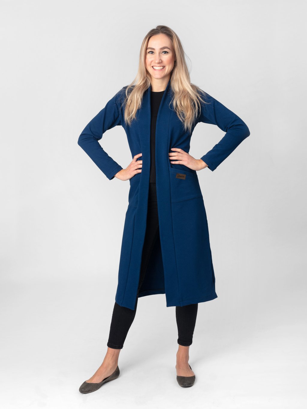 Dlouhá délka spolu s rozparky dodává kardiganu moderní vzhled a zároveň umožňuje volný pohyb. Prostorné kapsy nejsou jen praktickým, ale i designovým prvkem, který podtrhuje jeho ležérně-elegantní charakter.