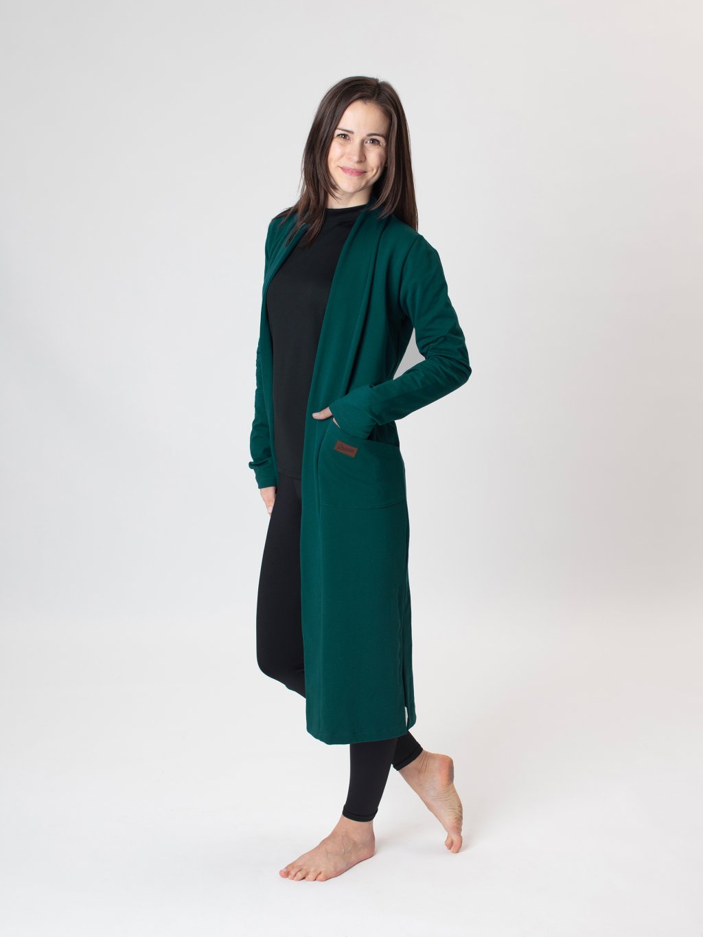 Dlouhá délka spolu s rozparky dodává kardiganu moderní vzhled a zároveň umožňuje volný pohyb. Prostorné kapsy nejsou jen praktickým, ale i designovým prvkem, který podtrhuje jeho ležérně-elegantní charakter.