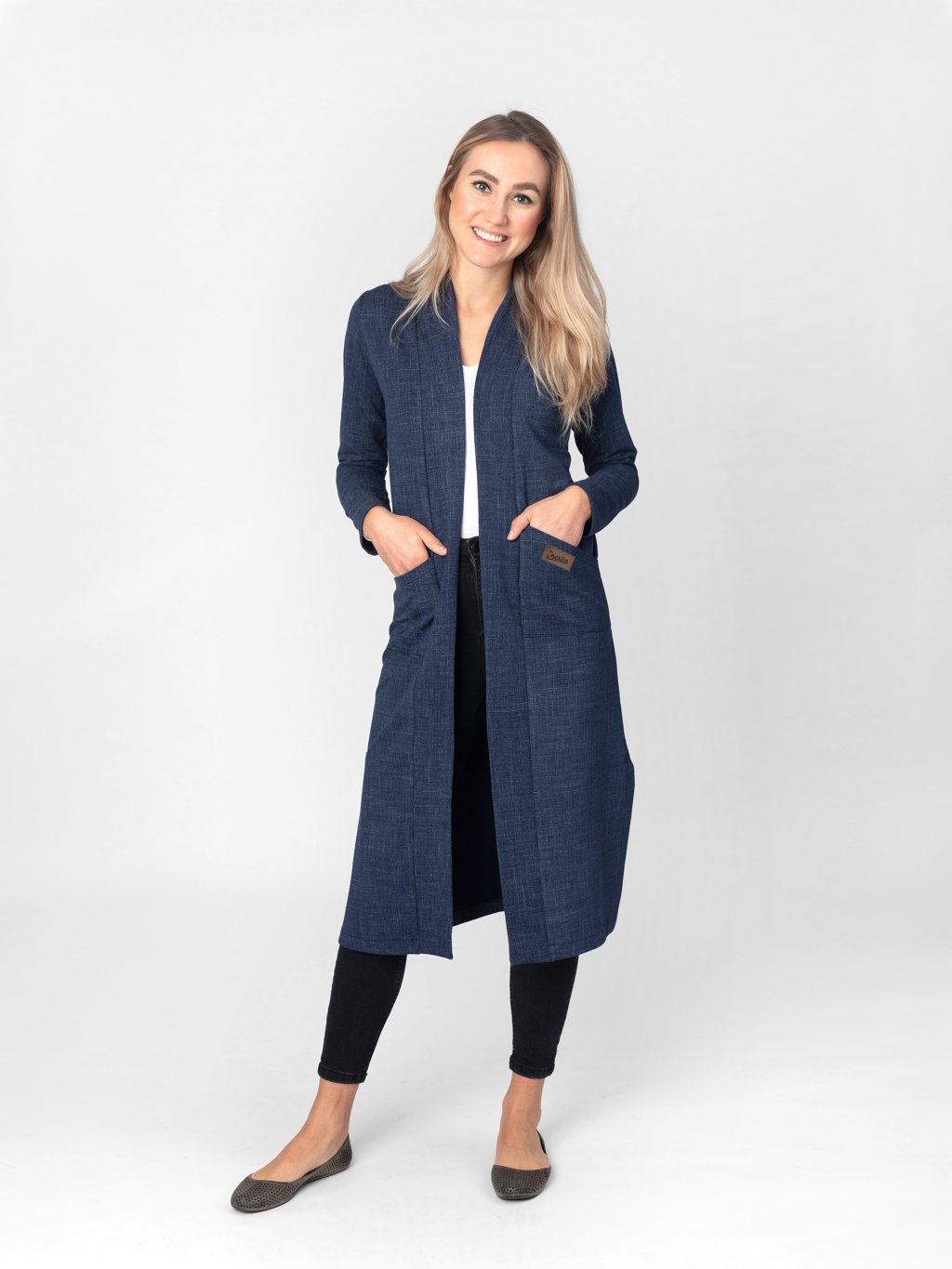 Dlouhá délka spolu s rozparky dodává kardiganu moderní vzhled a zároveň umožňuje volný pohyb. Prostorné kapsy nejsou jen praktickým, ale i designovým prvkem, který podtrhuje jeho ležérně-elegantní charakter.