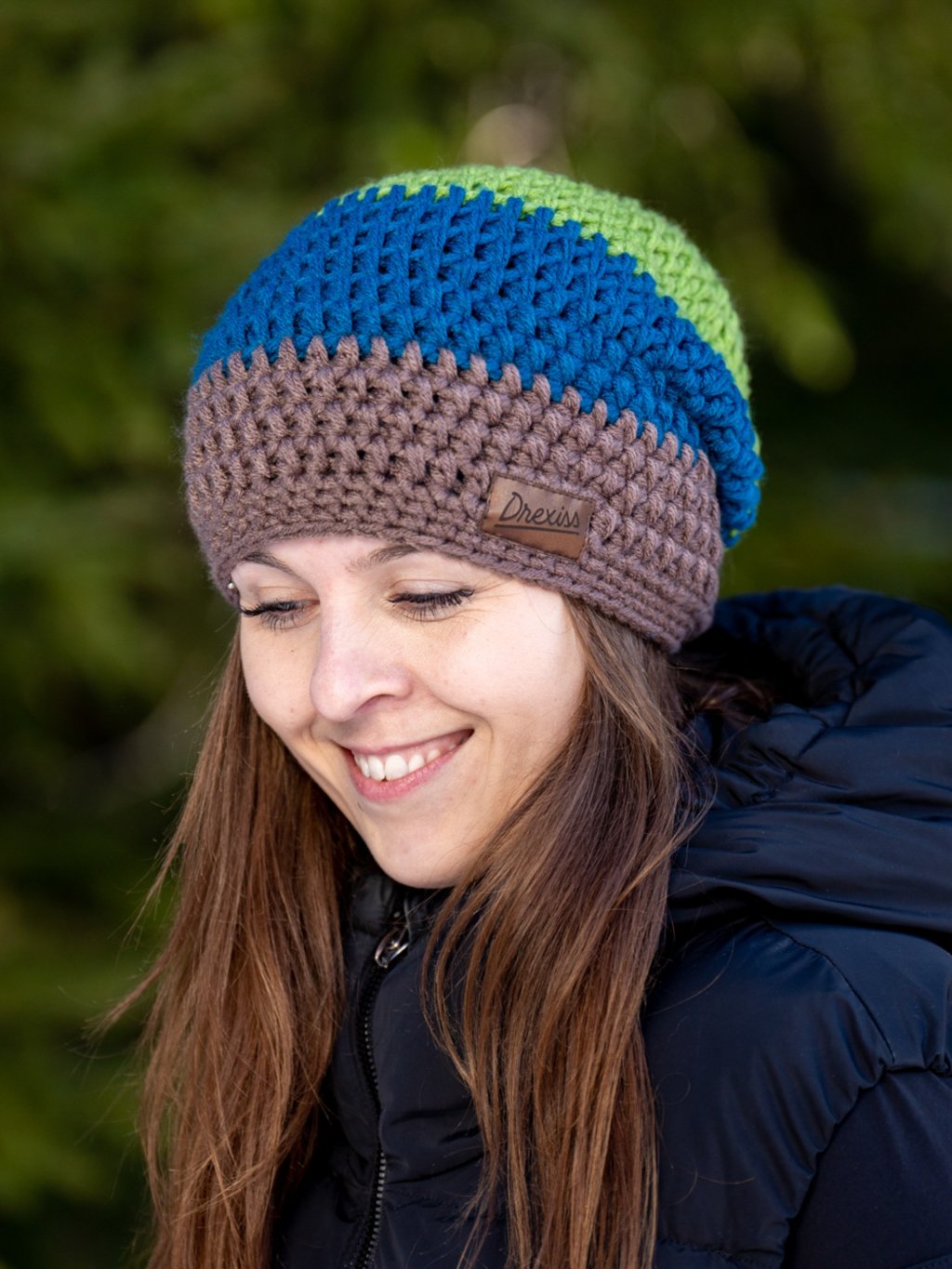 Každý kulich je ručně háčkovaný. Spodní lem je uháčkovaný pevněji, aby dobře držel i na menší hlavě, a postupným nošením, případným roztažením se přirozeně přizpůsobí.