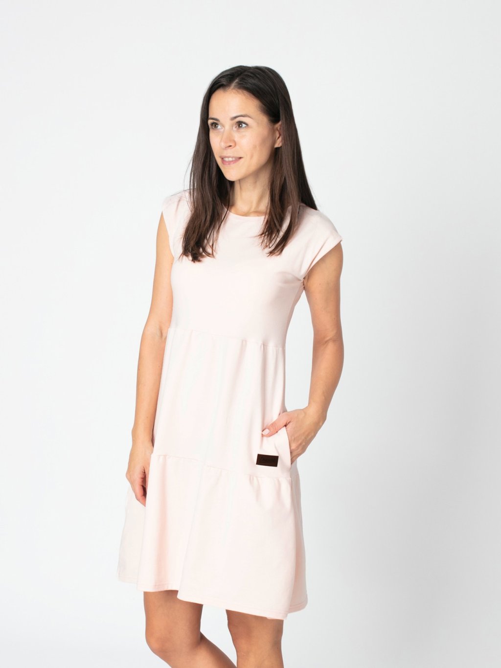 Šaty SOFIE působí uvolněně, ale zároveň stylově díky postupně členěnému střihu. Lodičkový výstřih a krátké rukávy dodávají šatům čistý a elegantní vzhled. Kapsy přidávají praktičnost.