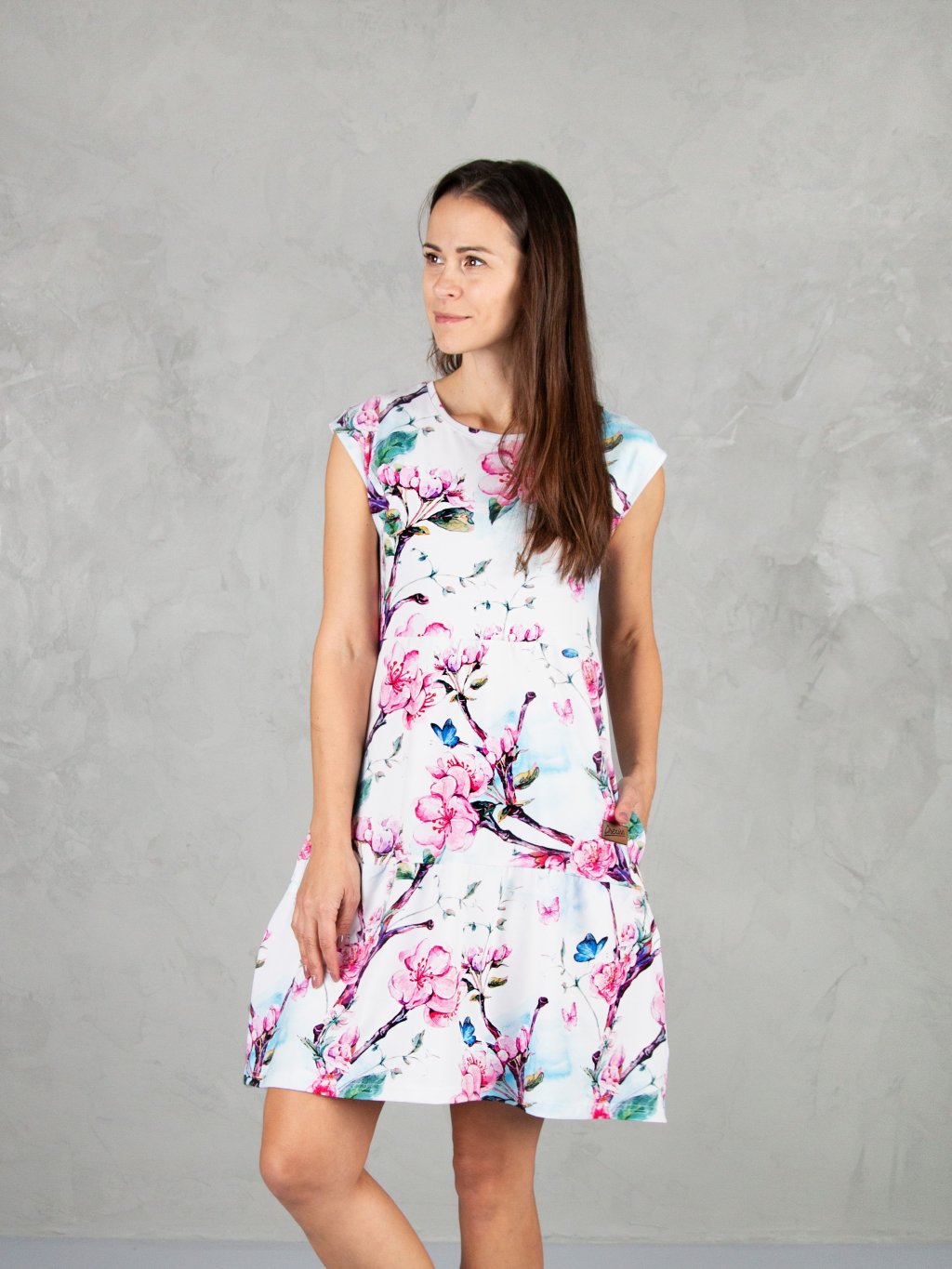 Šaty SOFIE působí uvolněně, ale zároveň stylově díky postupně členěnému střihu. Lodičkový výstřih a krátké rukávy dodávají šatům čistý a elegantní vzhled. Kapsy přidávají praktičnost.