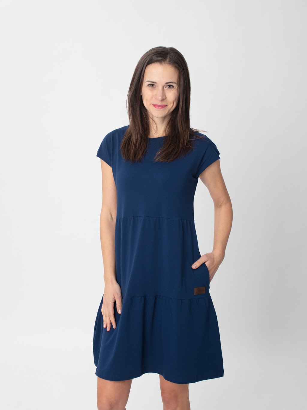 Šaty SOFIE působí uvolněně, ale zároveň stylově díky postupně členěnému střihu. Lodičkový výstřih a krátké rukávy dodávají šatům čistý a elegantní vzhled. Kapsy přidávají praktičnost.