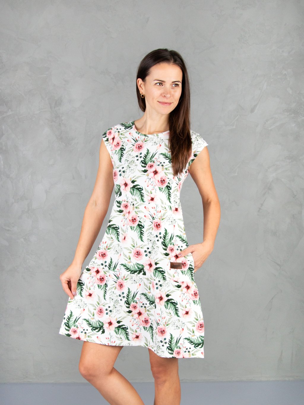 Šaty SOFIE působí uvolněně, ale zároveň stylově díky postupně členěnému střihu. Lodičkový výstřih a krátké rukávy dodávají šatům čistý a elegantní vzhled. Kapsy přidávají praktičnost.