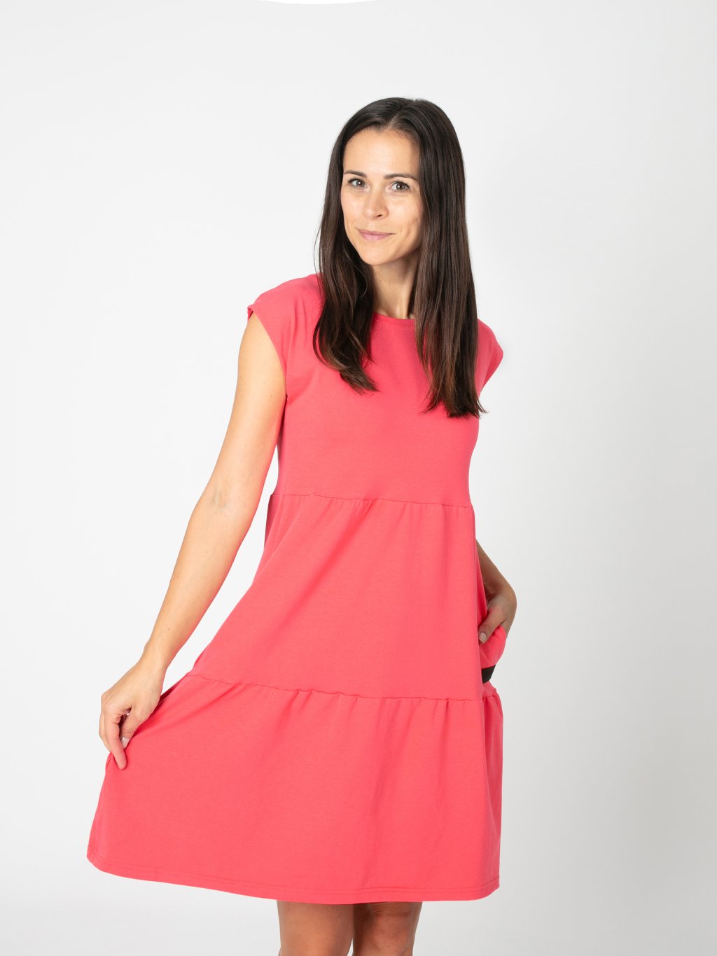 Šaty SOFIE působí uvolněně, ale zároveň stylově díky postupně členěnému střihu. Lodičkový výstřih a krátké rukávy dodávají šatům čistý a elegantní vzhled. Kapsy přidávají praktičnost.