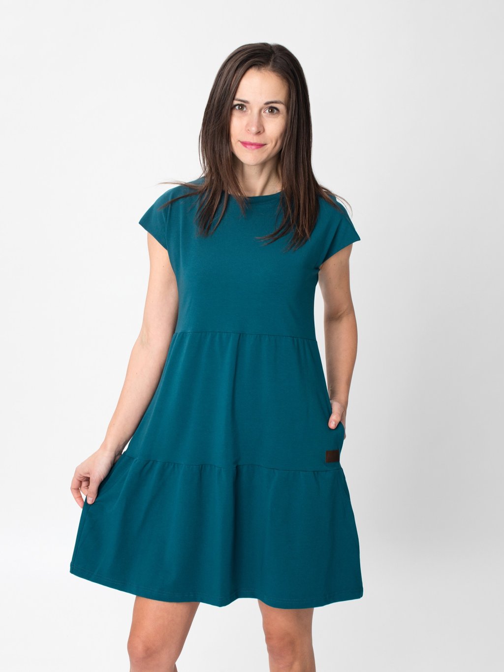Šaty SOFIE působí uvolněně, ale zároveň stylově díky postupně členěnému střihu. Lodičkový výstřih a krátké rukávy dodávají šatům čistý a elegantní vzhled. Kapsy přidávají praktičnost.