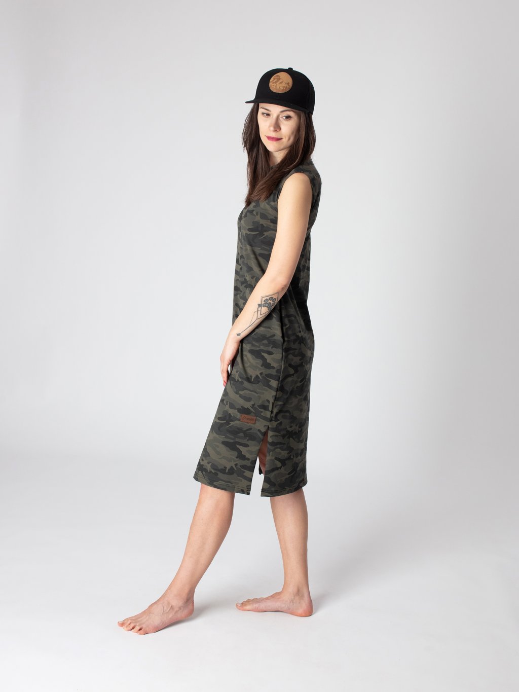Maxišaty v midi délce působí uvolněně, ale zároveň stylově díky lehce projmutému střihu s jemnými detaily. Decentní stojáček, krátké rukávy a rozparky dodávají šatům čistý a elegantní vzhled, zatímco kapsy přidávají na praktičnosti.