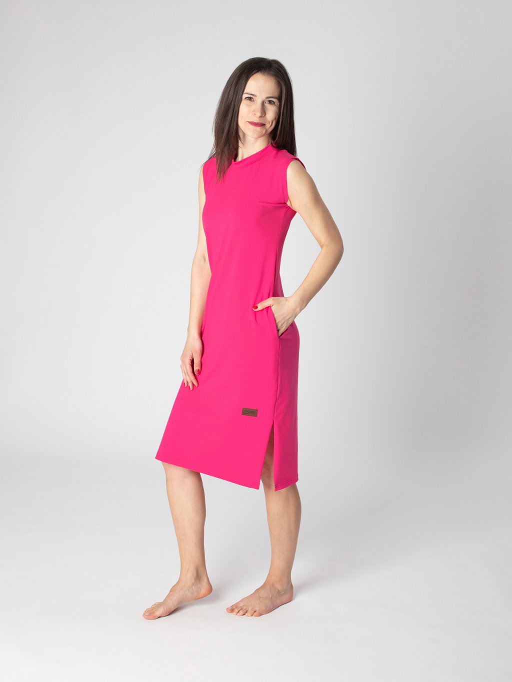 Maxišaty v midi délce působí uvolněně, ale zároveň stylově díky lehce projmutému střihu s jemnými detaily. Decentní stojáček, krátké rukávy a rozparky dodávají šatům čistý a elegantní vzhled, zatímco kapsy přidávají na praktičnosti.