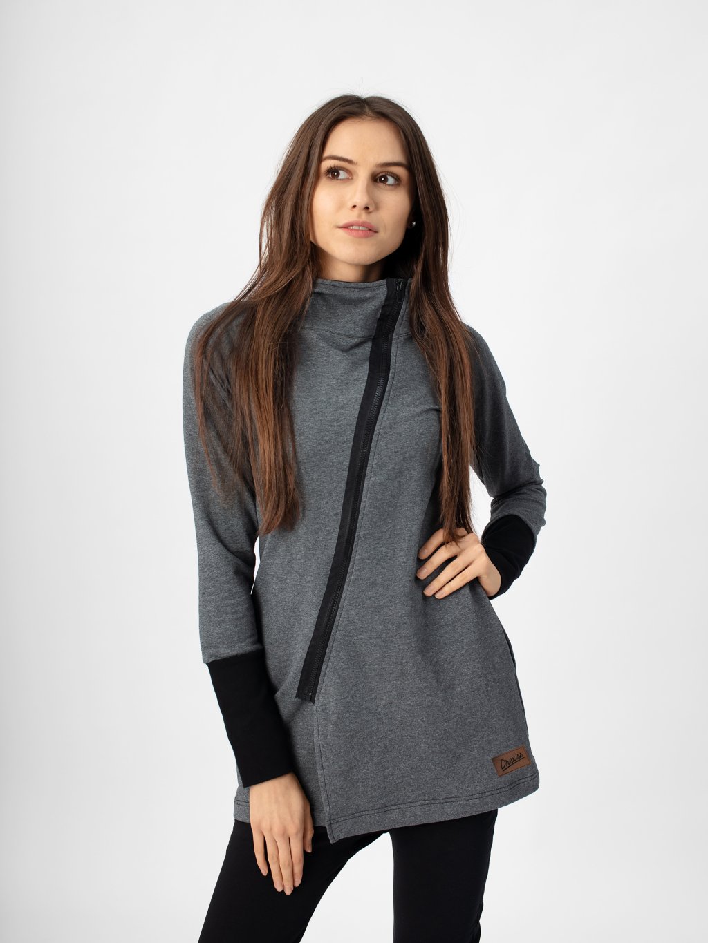 - Asymetrický zip – originální prvek, který dodává mikině jedinečný vzhled.