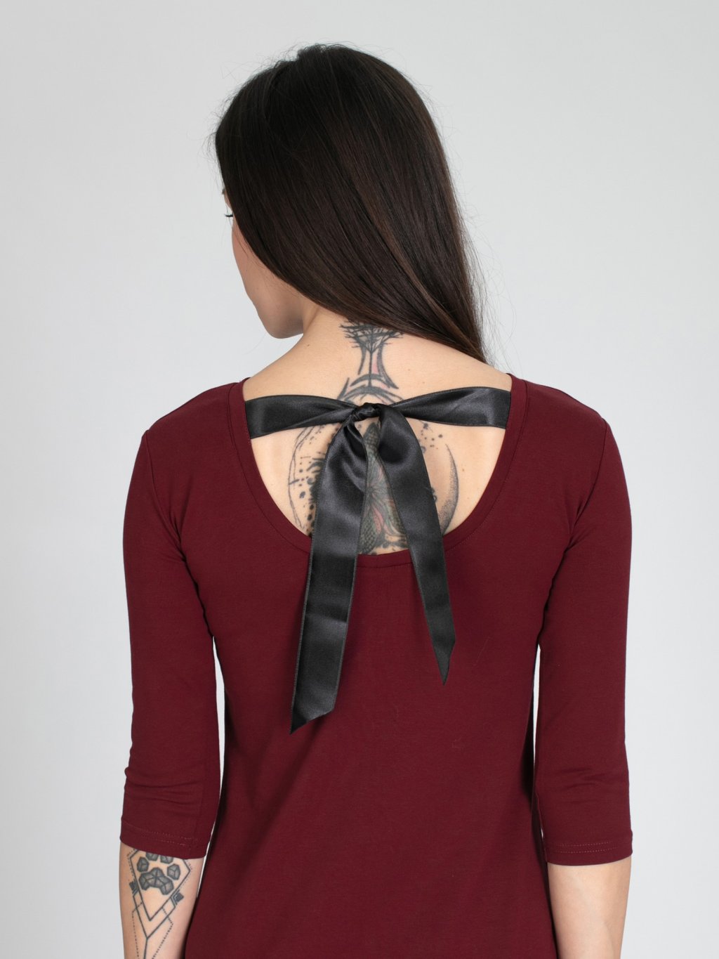 - Otevřená záda se saténovou mašlí – romantický prvek, který dělá šaty jedinečnými.