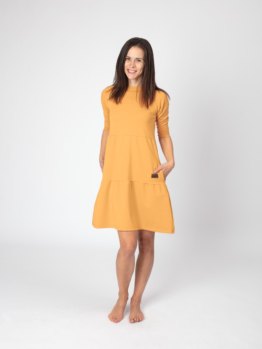 Podzimní šaty SOFIE jsou navrženy pro každodenní pohodlí i stylový vzhled. Lodičkový výstřih působí jemně a elegantně, zatímco postupně členitý střih dodává šatům vzdušnost a lehký pohyb. Praktické kapsy přidávají ležérní prvek a zvyšují jejich využitelnost v běžném nošení. Tříčtvrteční rukávy jsou praktické do proměnlivého počasí.