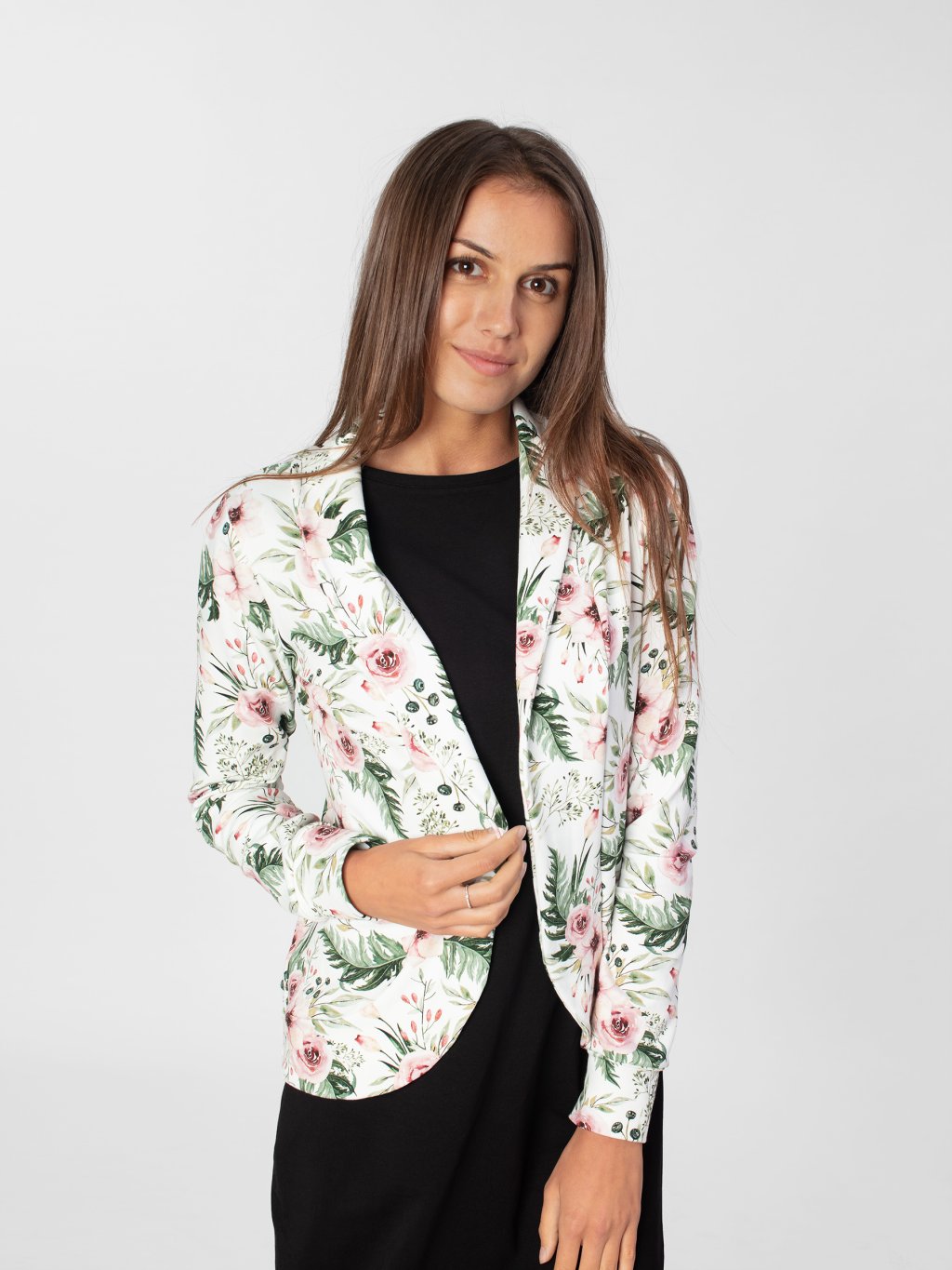 Délka saka je navržena tak, aby lemovala pas, což lichotí postavě a umožňuje snadné kombinování s kalhotami, sukní nebo šaty. Absence kapes zachovává čistý a uhlazený design, díky kterému působí nadčasově a univerzálně.