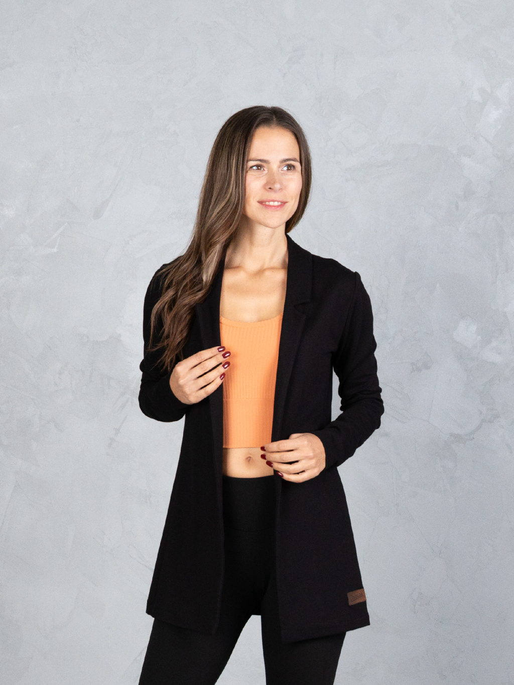 Dámské sako LISS je nadčasovým kouskem, který podtrhne váš osobitý styl a zároveň nabídne maximální pohodlí. Otevřený střih bez zapínání působí ležérně, ale přitom elegantně