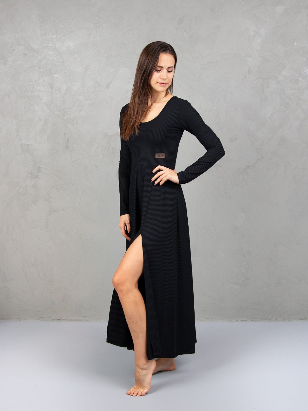 - Dlouhá sukně s vysokým rozparkem: Šaty dodávají elegantní a sofistikovaný vzhled, zároveň poskytují volnost pohybu.
