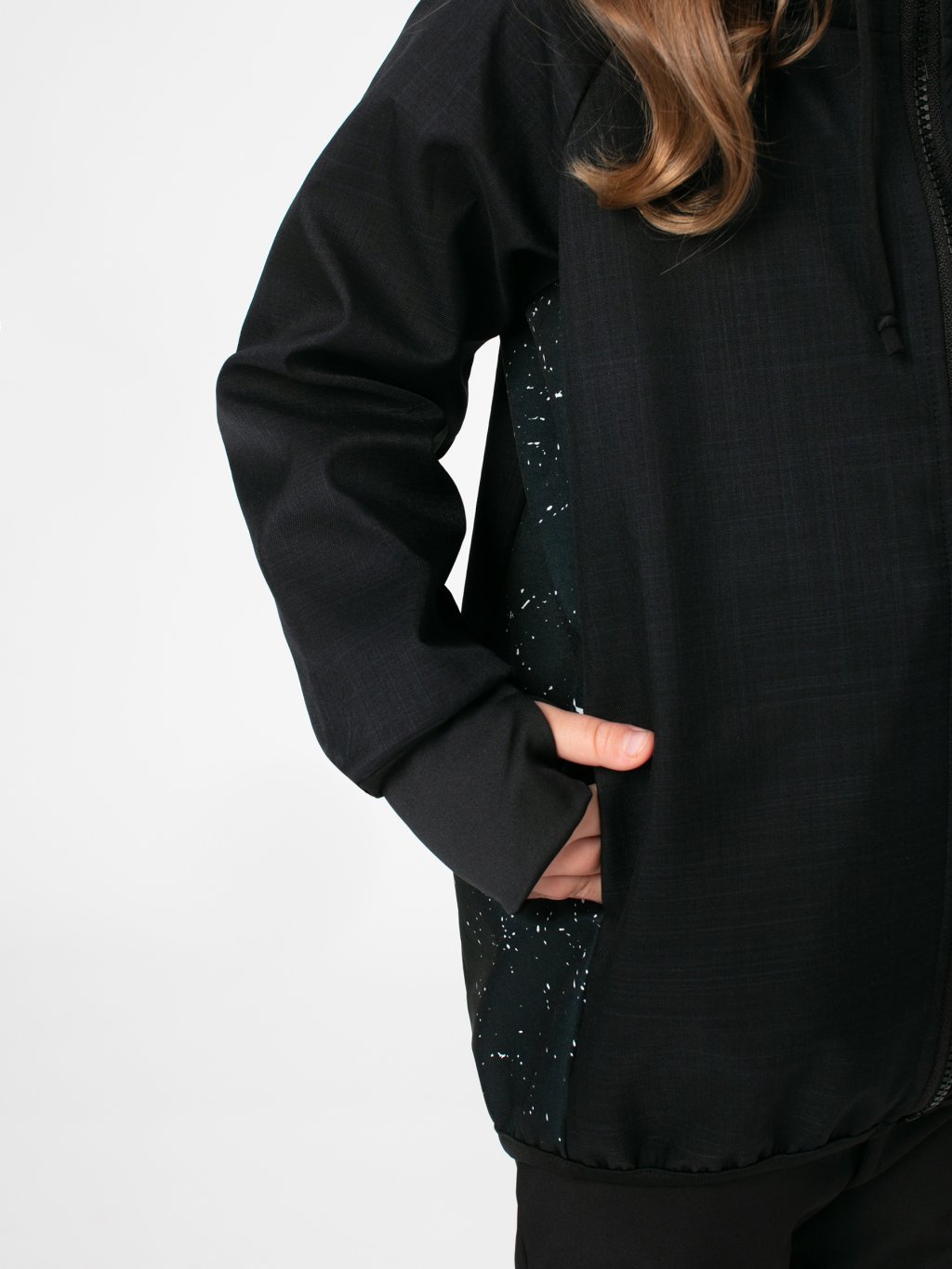 Bunda má prodloužený střih, který chrání záda před ofouknutím, a široké náplety s dírou na palec, díky nimž rukávy dobře drží a zahřejí i část ruky. Prostorná kapuce se stahováním ochrání před deštěm a větrem, zatímco skryté boční kapsy pojmou kapesník, rukavice nebo nasbírané poklady z přírody. Design doplňují originální grafické prvky umístěné na jednom rukávu a boku.