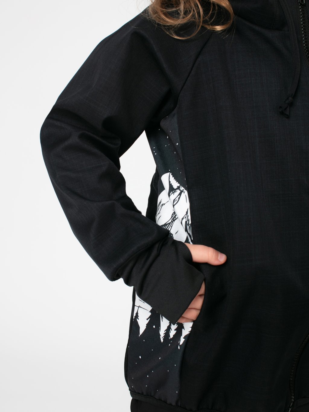 Bunda má prodloužený střih, který chrání záda před ofouknutím, a široké náplety s dírou na palec, díky nimž rukávy dobře drží a zahřejí i část ruky. Prostorná kapuce se stahováním ochrání před deštěm a větrem, zatímco skryté boční kapsy pojmou kapesník, rukavice nebo nasbírané poklady z přírody. Design doplňují originální grafické prvky umístěné na jednom rukávu a boku.