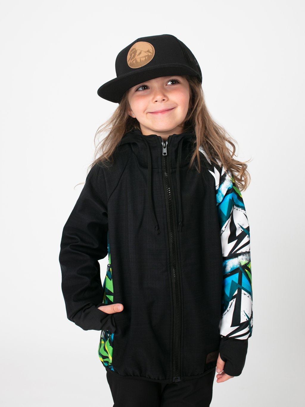 Bunda má prodloužený střih, který chrání záda před ofouknutím, a široké náplety s dírou na palec, díky nimž rukávy dobře drží a zahřejí i část ruky. Prostorná kapuce se stahováním ochrání před deštěm a větrem, zatímco skryté boční kapsy pojmou kapesník, rukavice nebo nasbírané poklady z přírody. Design doplňují originální grafické prvky umístěné na jednom rukávu a boku.