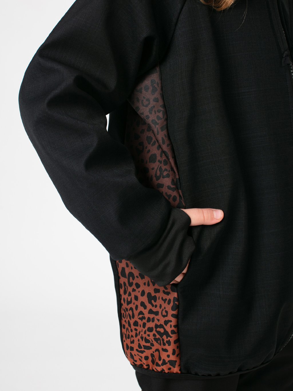 Bunda má prodloužený střih, který chrání záda před ofouknutím, a široké náplety s dírou na palec, díky nimž rukávy dobře drží a zahřejí i část ruky. Prostorná kapuce se stahováním ochrání před deštěm a větrem, zatímco skryté boční kapsy pojmou kapesník, rukavice nebo nasbírané poklady z přírody. Design doplňují originální grafické prvky umístěné na jednom rukávu a boku.