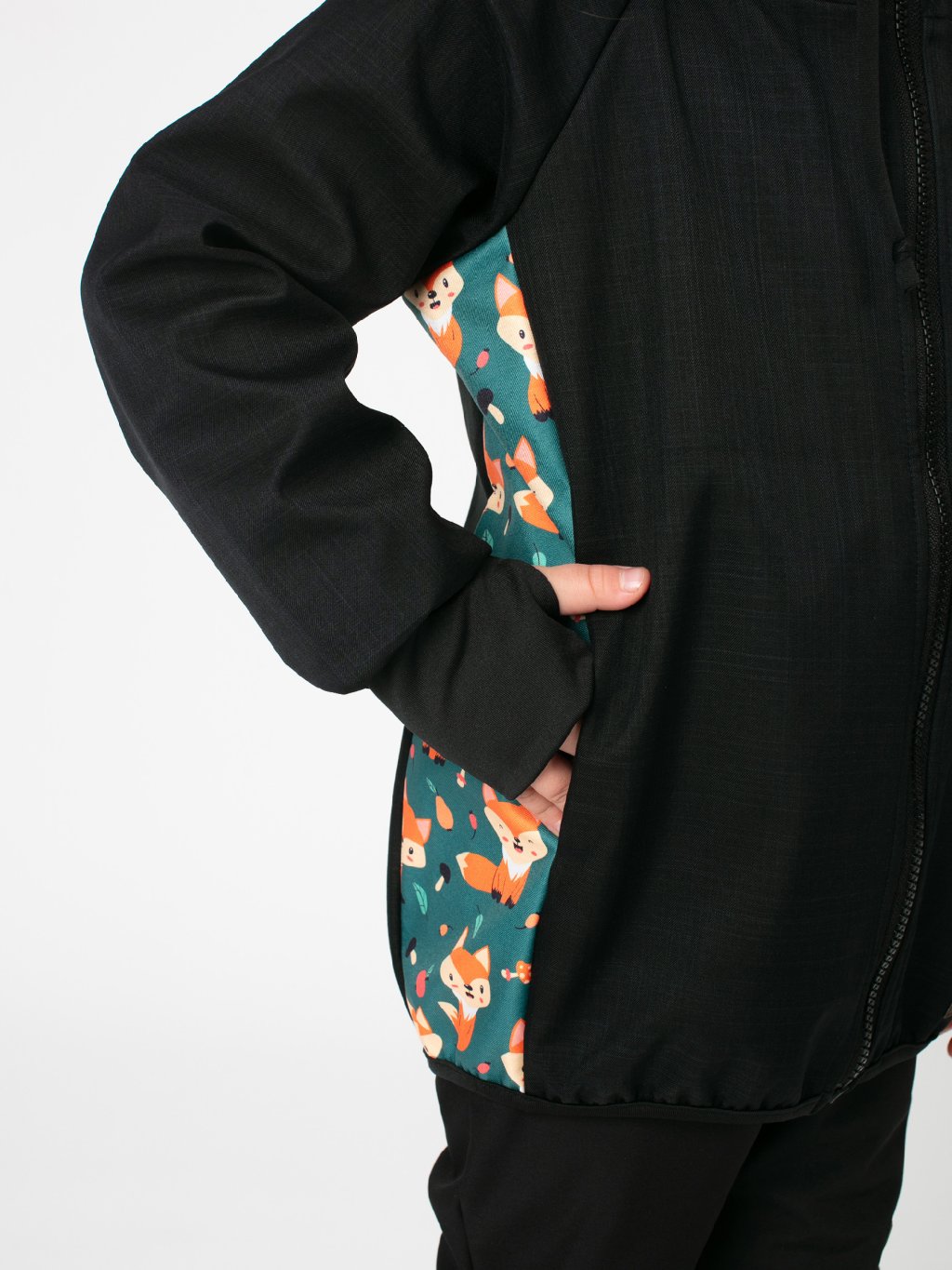 Bunda má prodloužený střih, který chrání záda před ofouknutím, a široké náplety s dírou na palec, díky nimž rukávy dobře drží a zahřejí i část ruky. Prostorná kapuce se stahováním ochrání před deštěm a větrem, zatímco skryté boční kapsy pojmou kapesník, rukavice nebo nasbírané poklady z přírody. Design doplňují originální grafické prvky umístěné na jednom rukávu a boku.