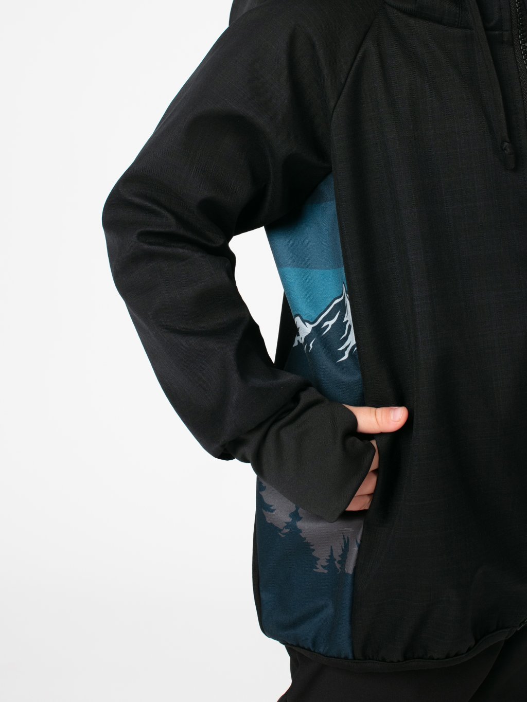 Bunda má prodloužený střih, který chrání záda před ofouknutím, a široké náplety s dírou na palec, díky nimž rukávy dobře drží a zahřejí i část ruky. Prostorná kapuce se stahováním ochrání před deštěm a větrem, zatímco skryté boční kapsy pojmou kapesník, rukavice nebo nasbírané poklady z přírody. Design doplňují originální grafické prvky umístěné na jednom rukávu a boku.
