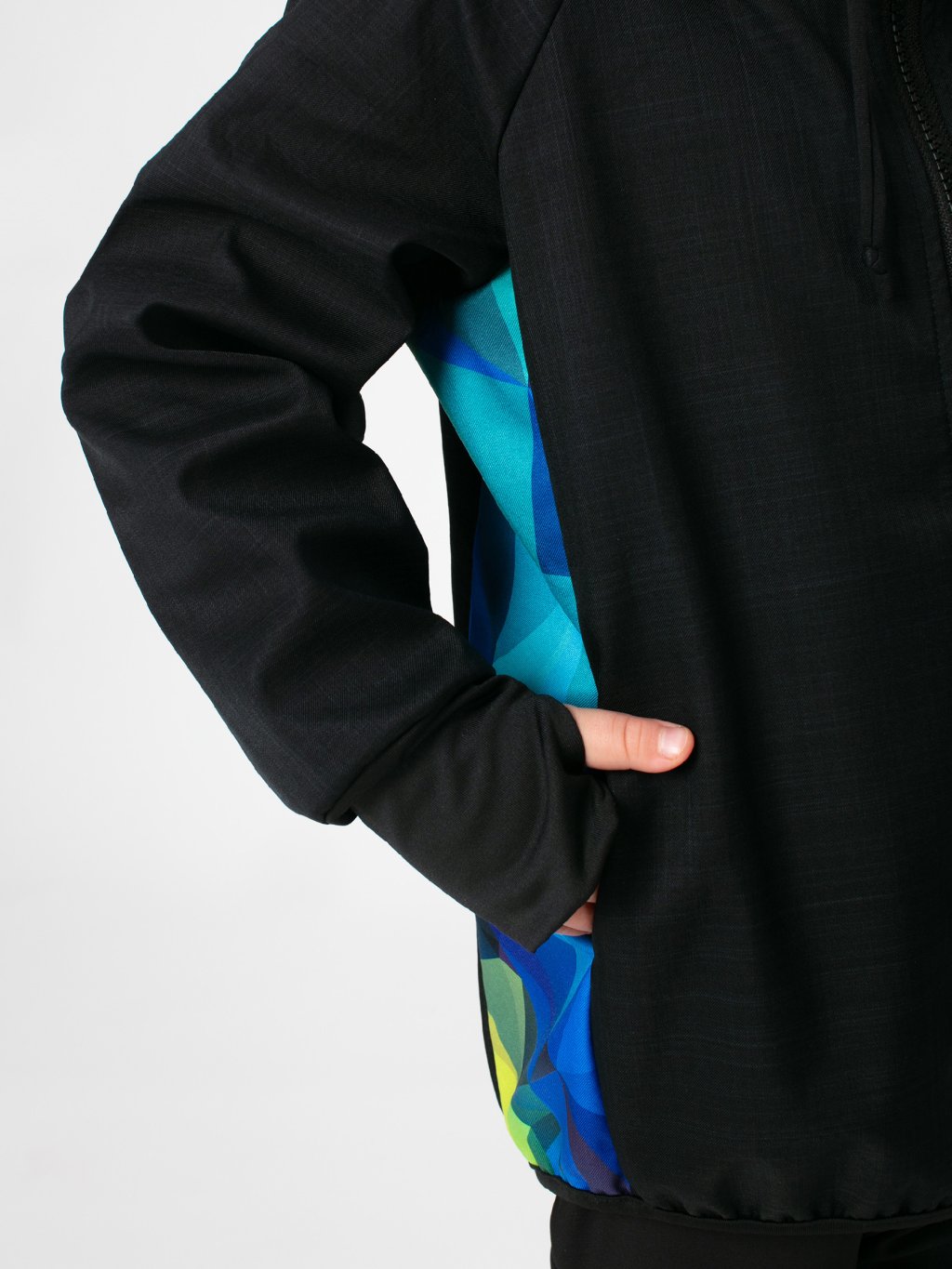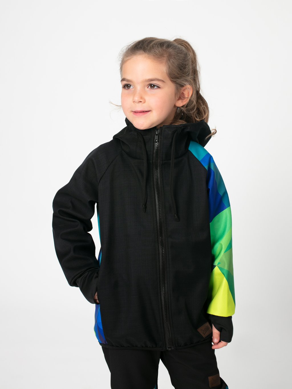Bunda má prodloužený střih, který chrání záda před ofouknutím, a široké náplety s dírou na palec, díky nimž rukávy dobře drží a zahřejí i část ruky. Prostorná kapuce se stahováním ochrání před deštěm a větrem, zatímco skryté boční kapsy pojmou kapesník, rukavice nebo nasbírané poklady z přírody. Design doplňují originální grafické prvky umístěné na jednom rukávu a boku.
