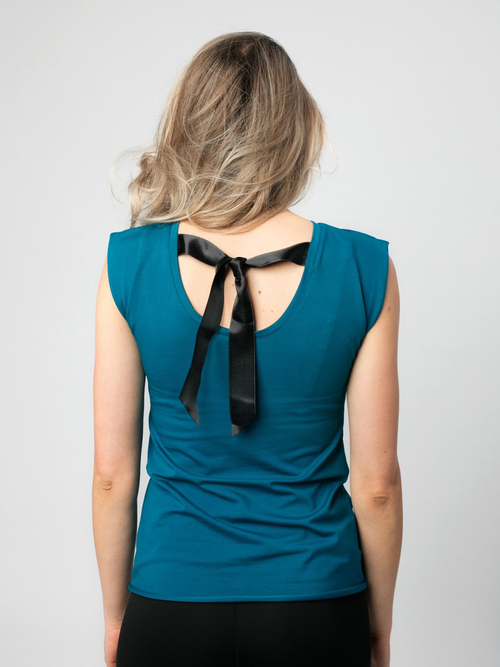 ANGELIKA je tričko, které zaujme svou čistou linií a promyšleným detailem. Přední díl je minimalistický a elegantní, díky čemuž dokonale vynikne zadní část – hlubší výstřih na zádech doplněný saténovou stuhou, který vytváří jemný, ale výrazný prvek.