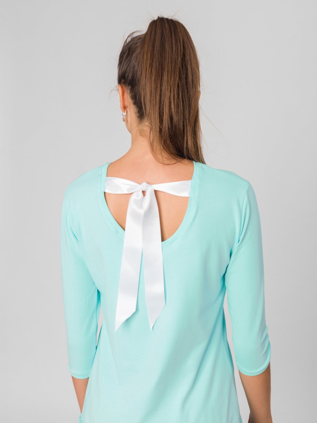 Lehce odhalená záda doplněná saténovou stuhou dodávají celému kousku ženskost a jemnou výjimečnost. Tričko je pohodlné, ženské a snadno kombinovatelné s džínami, sukní i kraťasy. Využití najde v práci, ve městě i během volného dne – v outfitu, který působí přirozeně a zároveň upraveně.