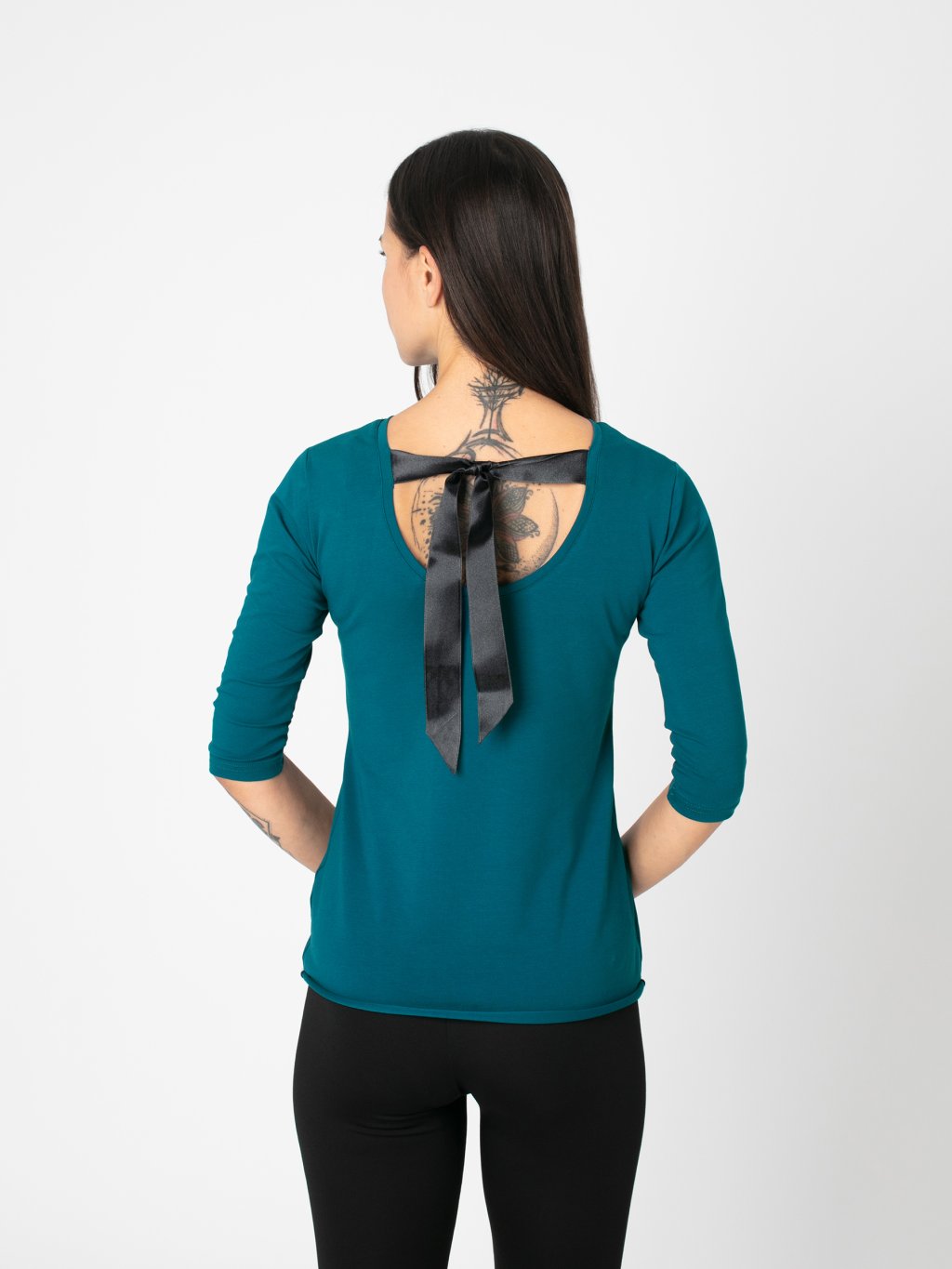 Lehce odhalená záda doplněná saténovou stuhou dodávají celému kousku ženskost a jemnou výjimečnost. Tričko je pohodlné, ženské a snadno kombinovatelné s džínami, sukní i kraťasy. Využití najde v práci, ve městě i během volného dne – v outfitu, který působí přirozeně a zároveň upraveně.