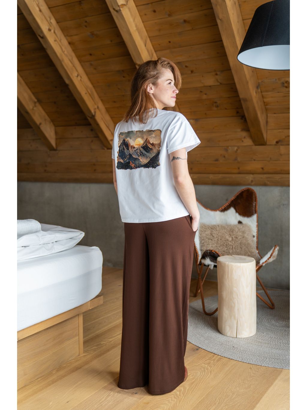 - Bavlněný úplet s elastanem – materiál je příjemný na dotek, skvěle se nosí a přizpůsobí se pohybu během dne.
