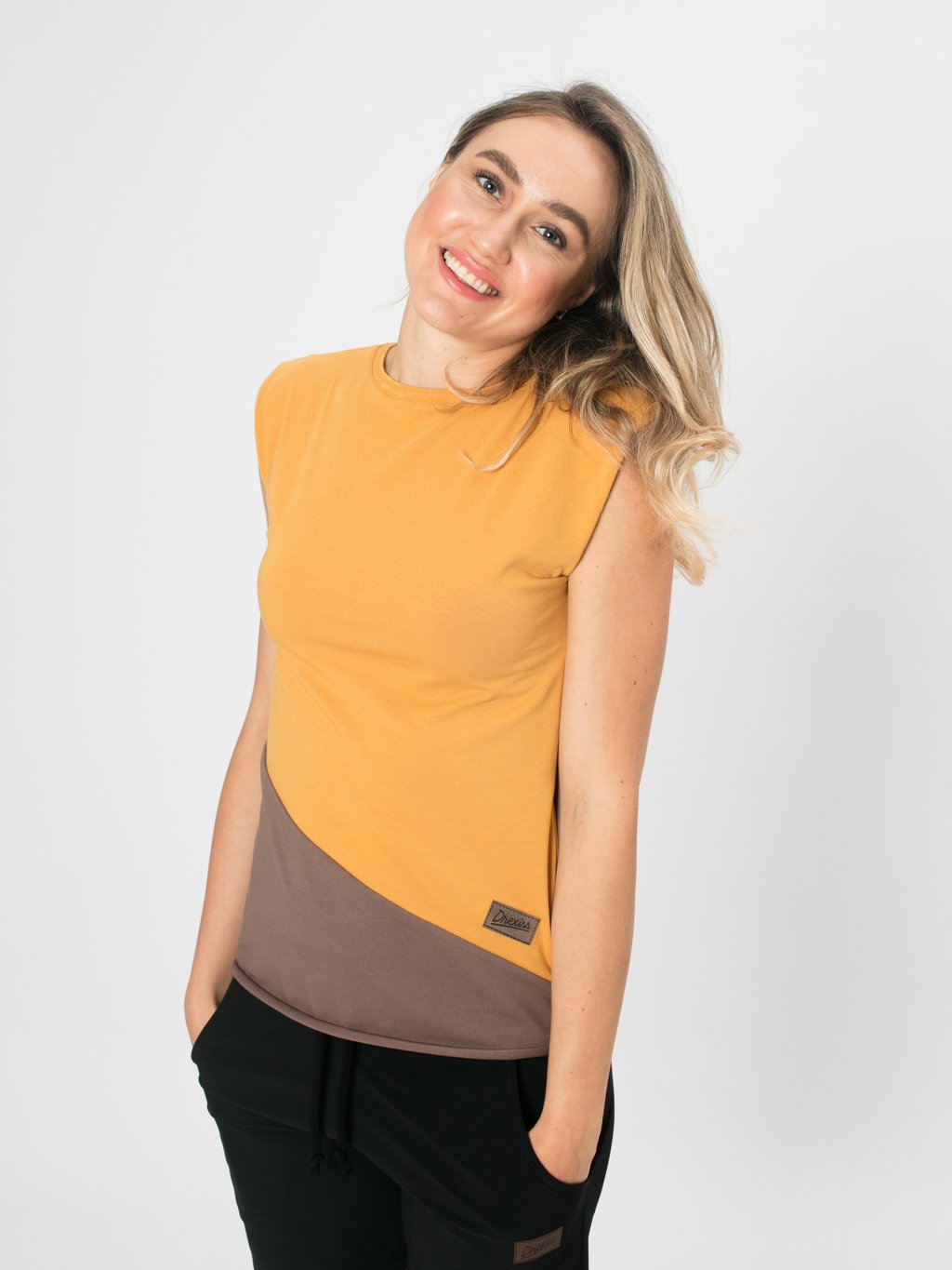 - Diagonální barevné dělení – originální designový prvek, který dodává tričku dynamiku