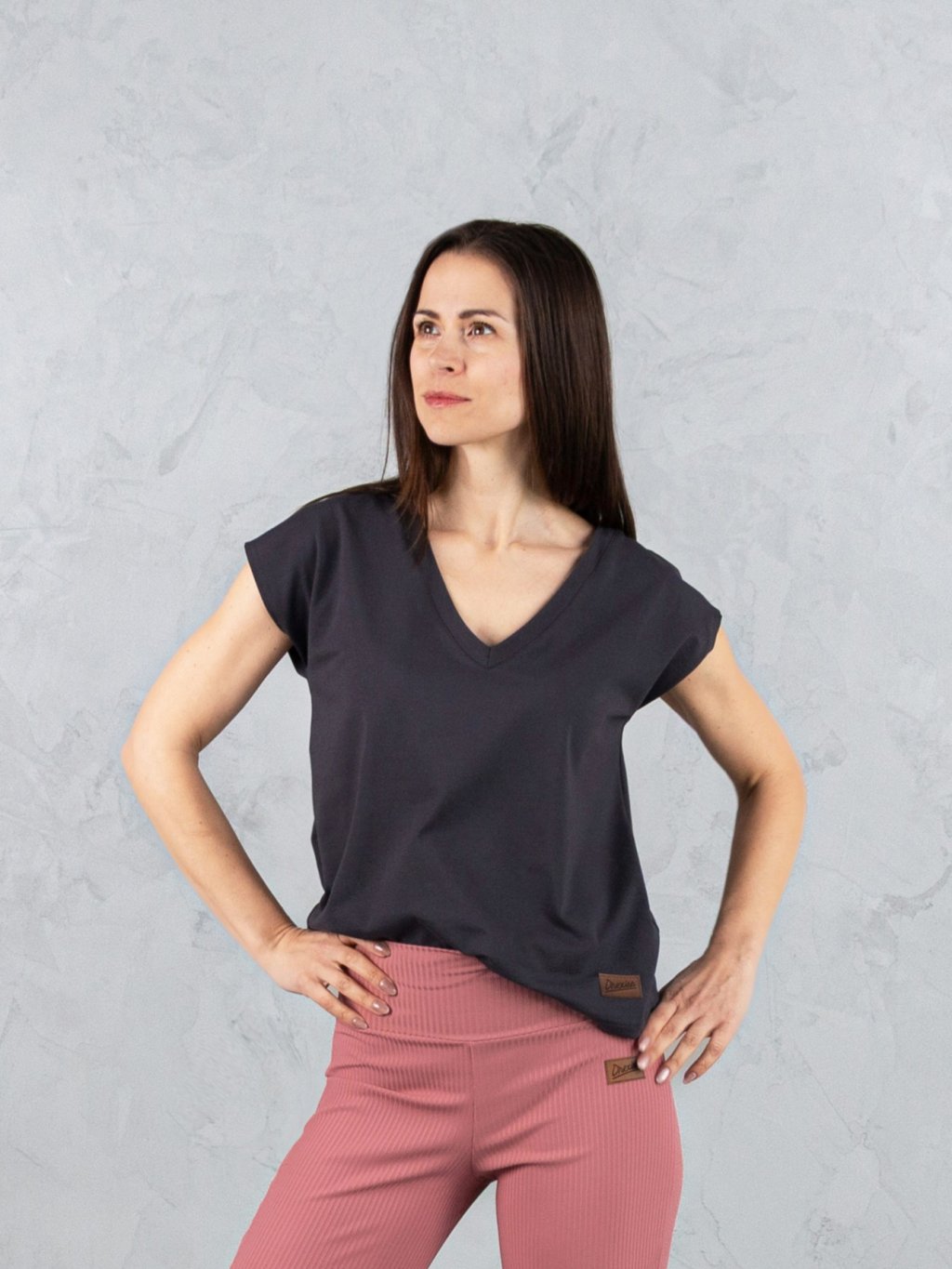 Spadlý rukávek a volnější střih dodávají tričku ležérní styl, zatímco výrazný V výstřih lichotí dekoltu. Můžete jej nosit volně nebo zastrčené – podle nálady a typu outfitu.